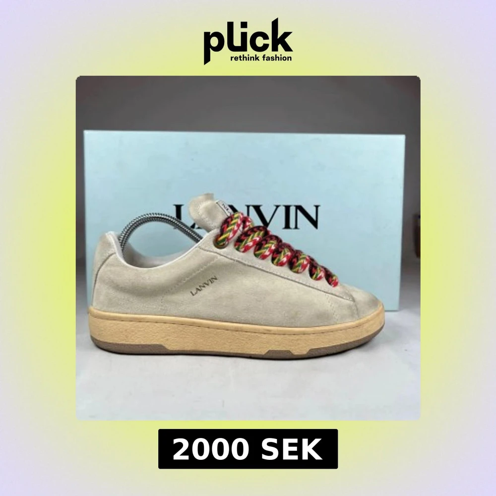 Lanvin sneakers i beige mocka med chunky, färgglada snören i rött, svart, gult och grönt. Skorna har en platt, beige sula och rund tå. Diskret Lanvin-logga på sidan och vit etikett på plösen. Perfekt för dig som gillar stilrena men ändå unika detaljer. Nästan som nya. Nypris ~4000kr. Dustbag eller box ingår ej. Pris kan alltid diskuteras! Skriv om du är intresserad så hjälper vi dig snabbt och ärligt! // By, Olsén, Closet.