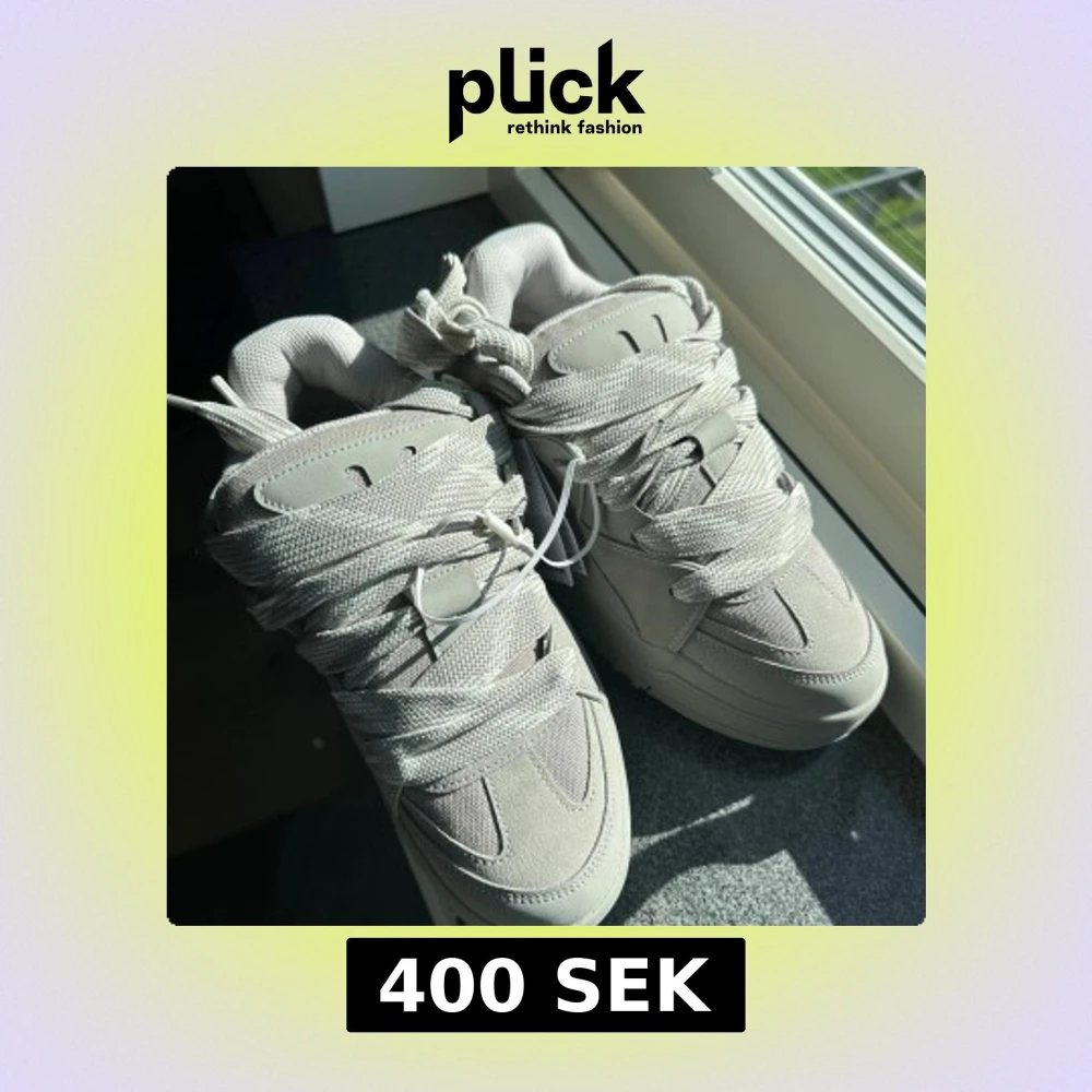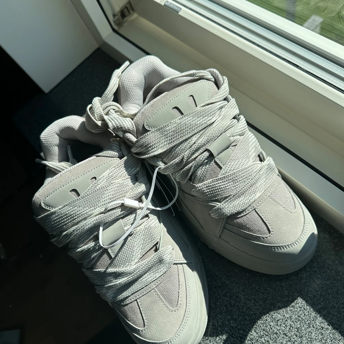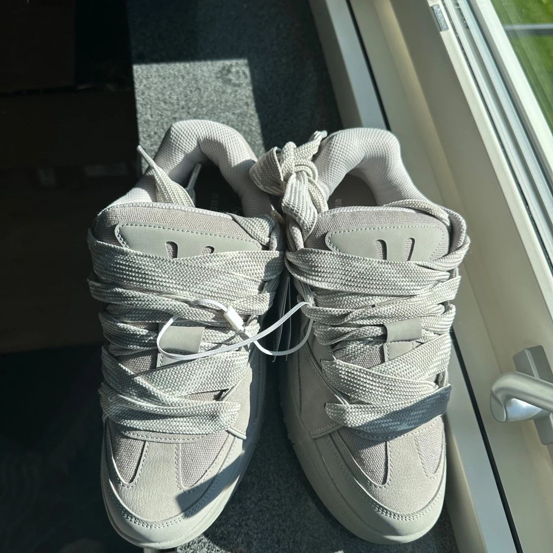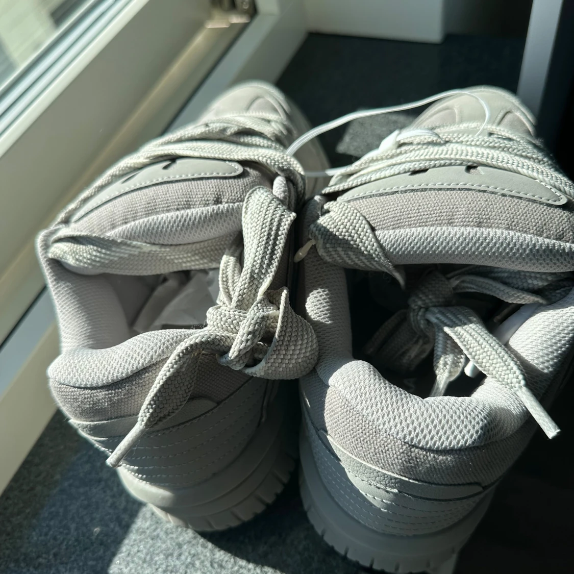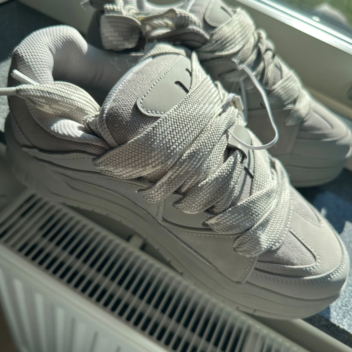 Säljer ett par chunky sneakers i ljusgrått med breda snören och plattformssula. Skorna har en mix av mocka och syntetmaterial, rund tå och coola detaljer på ovandelen. Perfekta för dig som gillar streetstyle och vill sticka ut med dina skor.