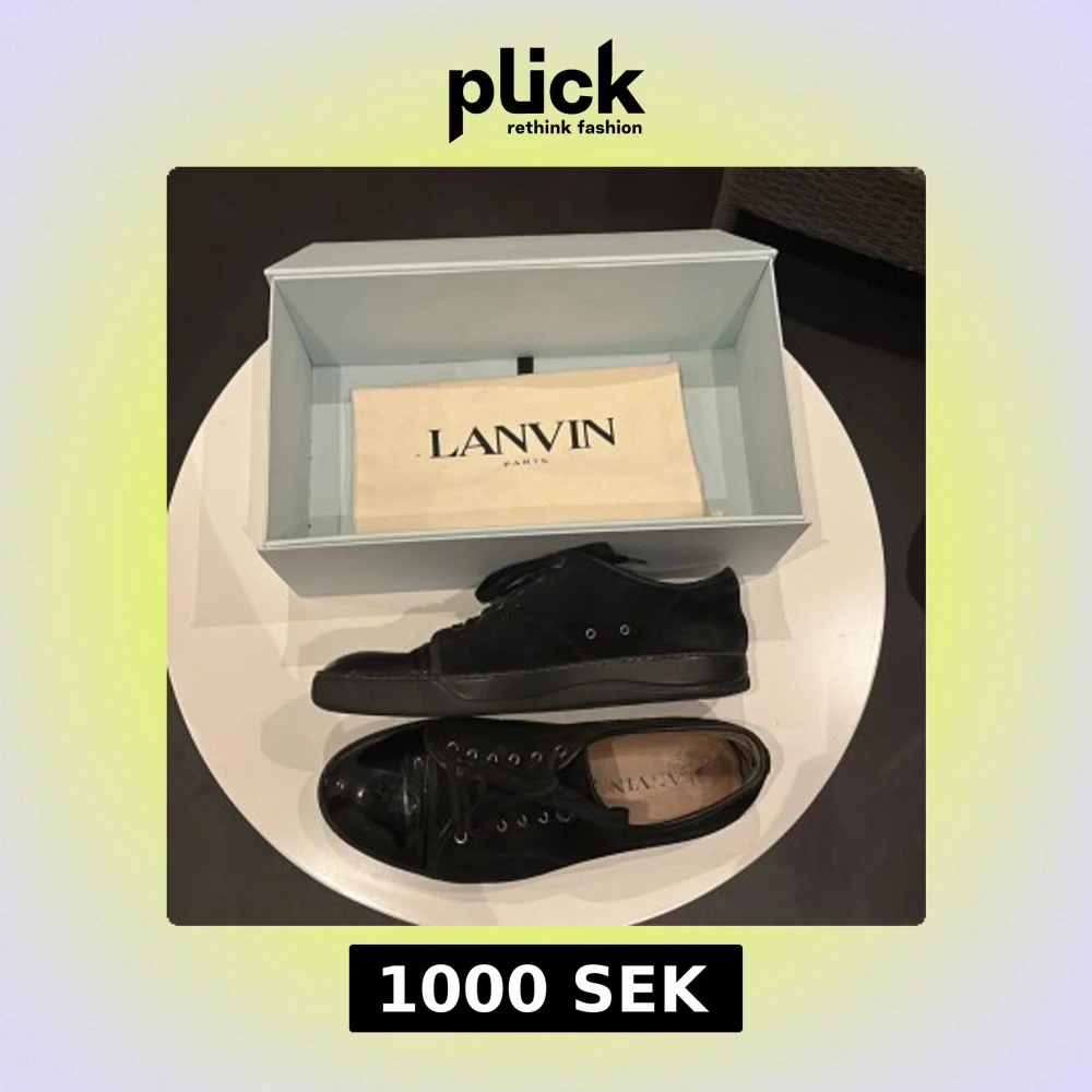 Snygga svarta sneakers från Lanvin med glansig där framm det är tyvärr litet hål i sulan där av priset. Vid snabb affär så kan priset sänkas.