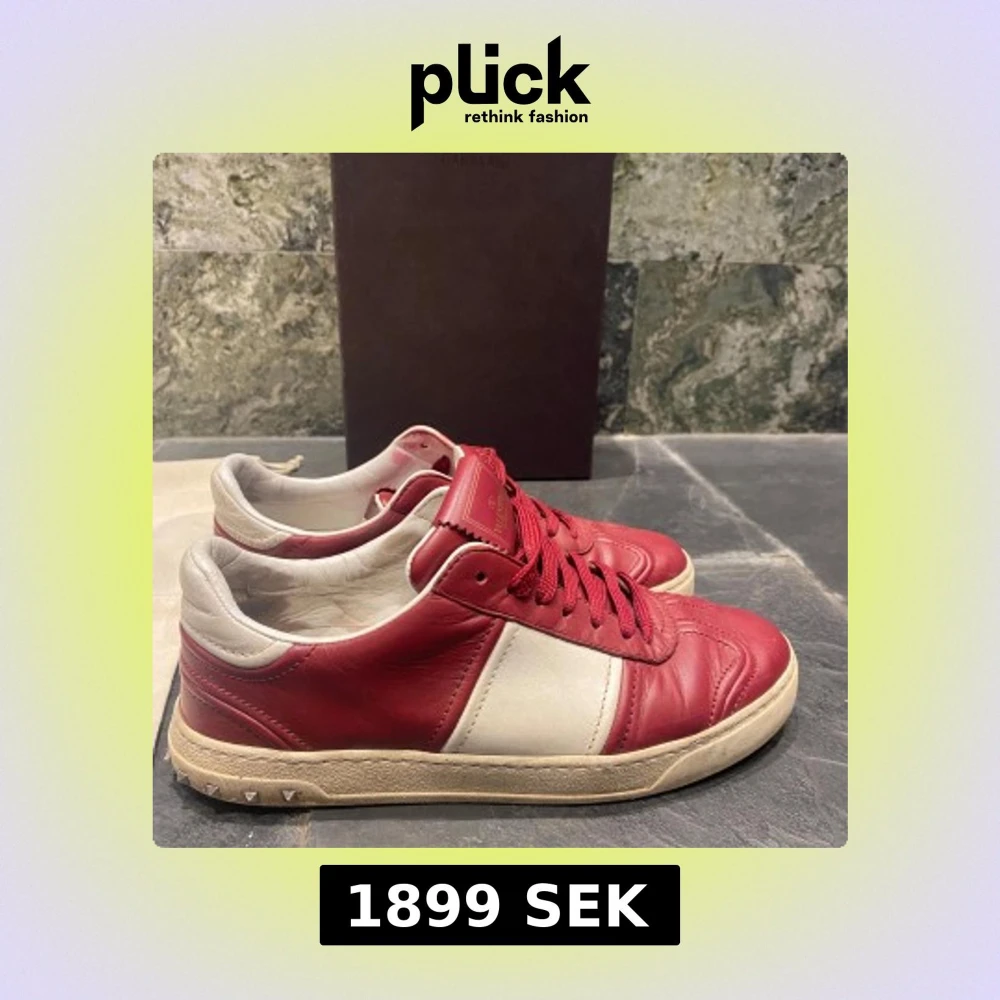 Snygga röda och vita sneakers från Valentino med snörning och nitar på sulan. Skorna har en stilren design med kontrasterande färger och är perfekta för en trendig look.