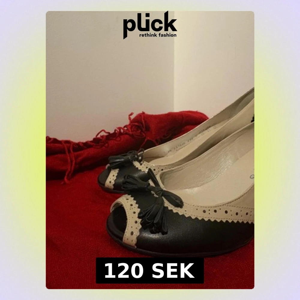 Snygga pumps från märket Alpina i beige och svart skinn med låg klack och öppen tå. Dekorativa rosetter framtill och fina detaljer längs kanten 🎀✨De är i princip oanvända men har några mindre märken (skriv till mig för bilder)☺️