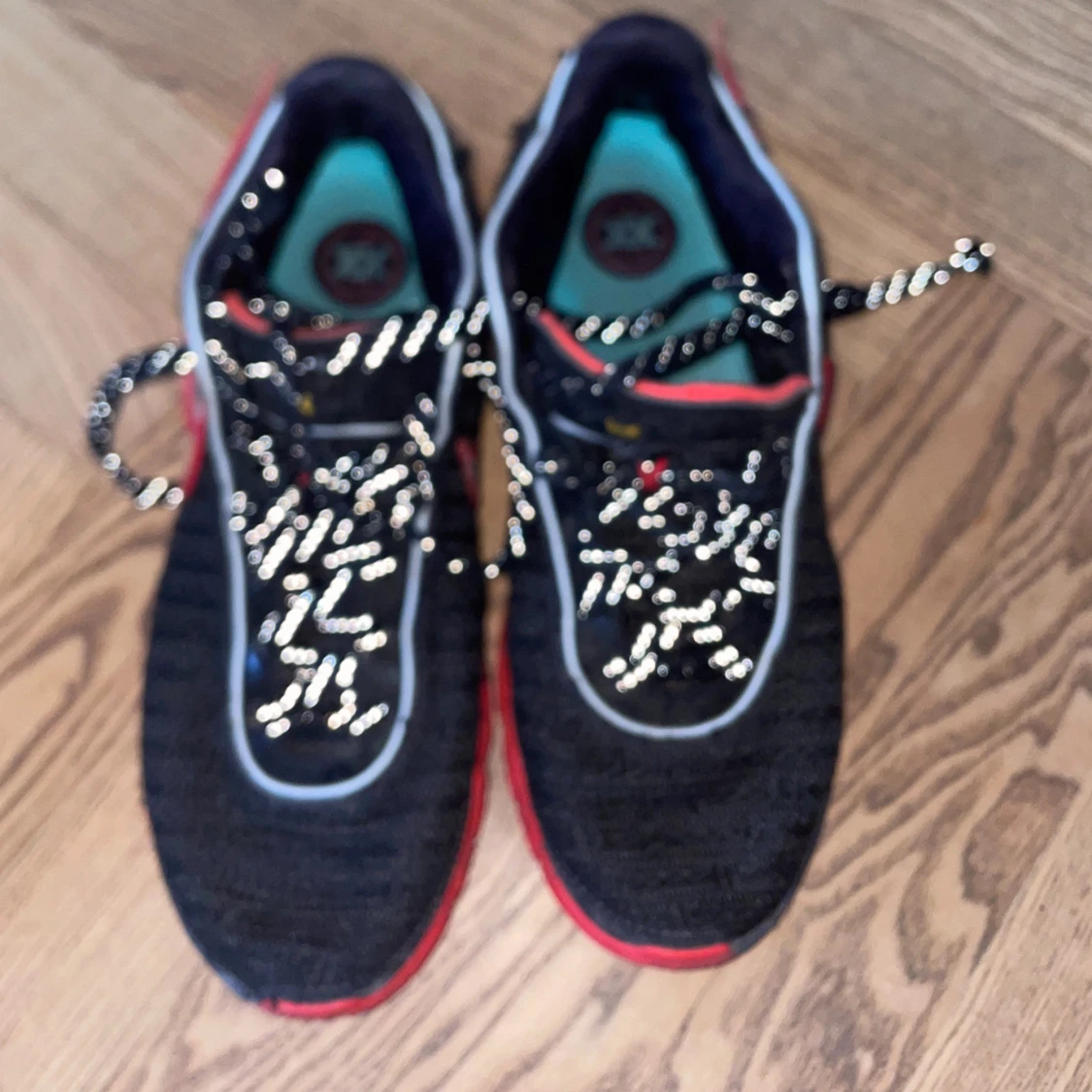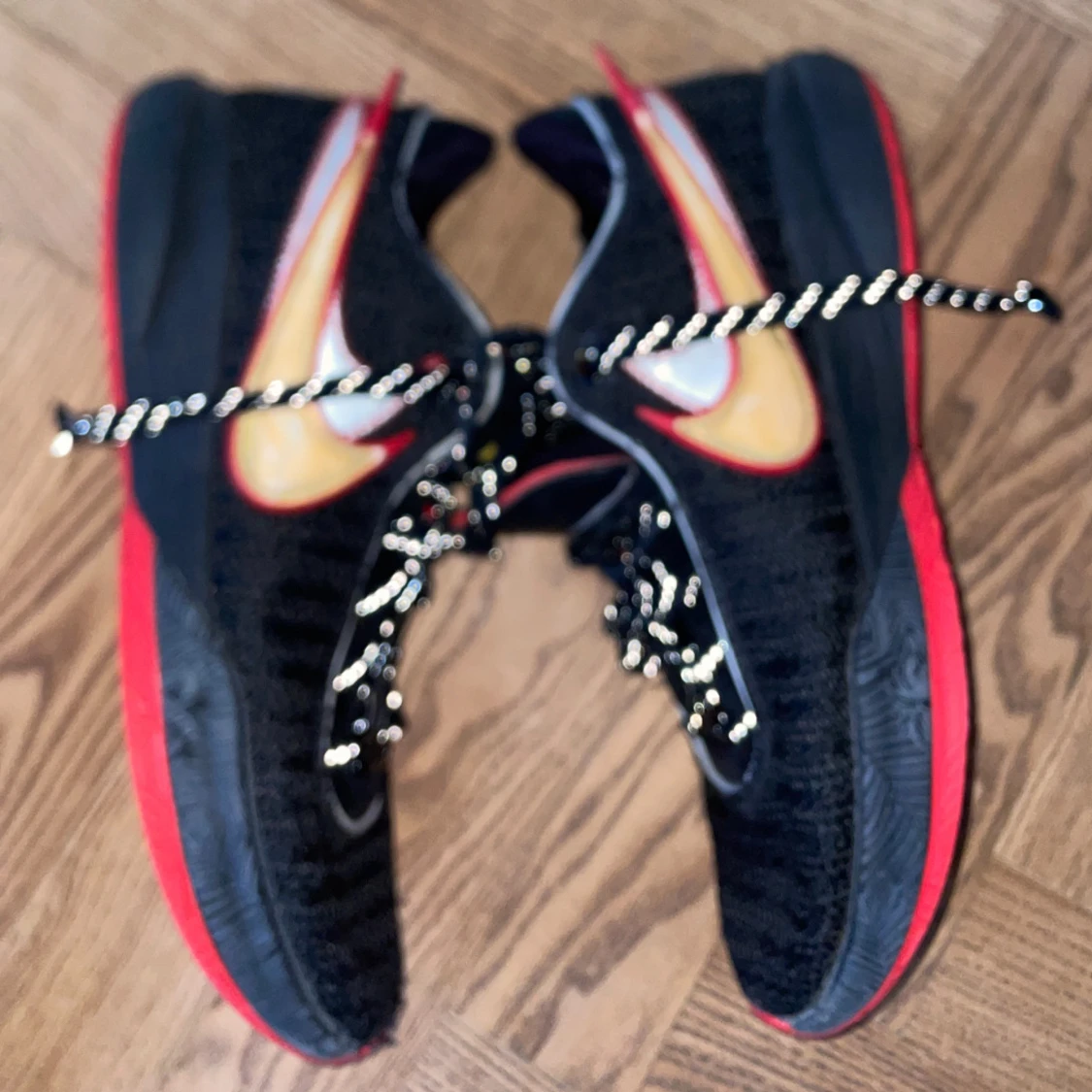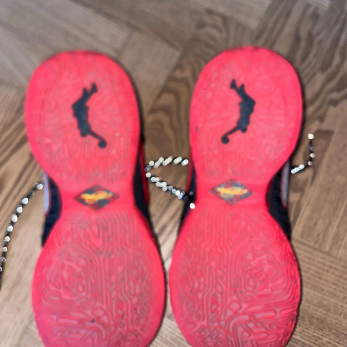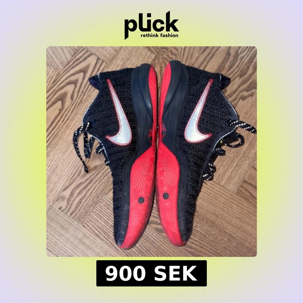 Säljer ett par svarta lebron sneakers med stickad ovandel och stora vita Swoosh-loggor med röd kant. Skorna har snörning med svarta och vita mönstrade skosnören samt en riktigt fet röd yttersula med basketikon. Perfekt för dig som gillar sportig och unik stil.
