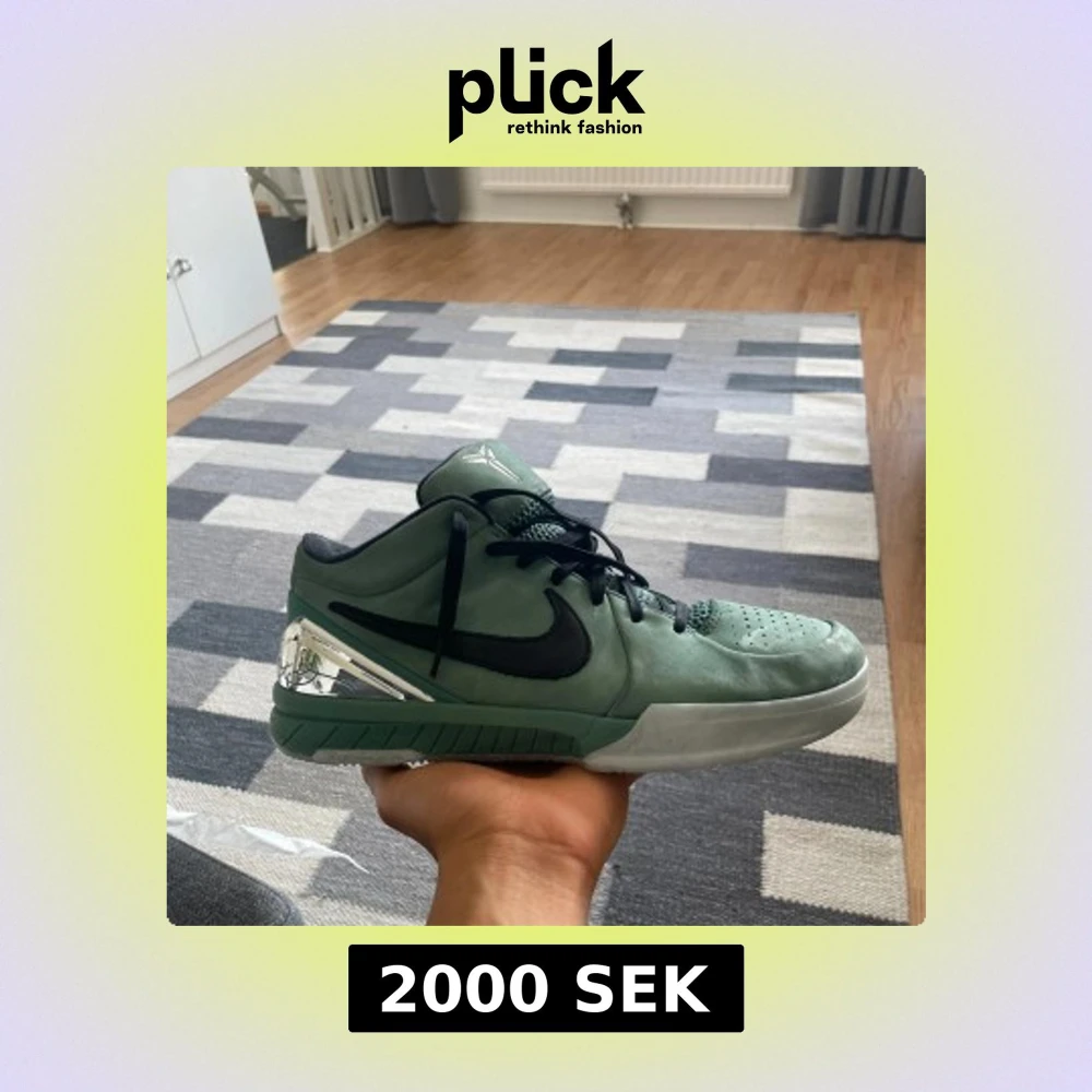 Säljer ett par Nike Kobe IV Protro i färgen girl and dad med chrome detaljer och silverinslag vid hälen. Skorna har svart snörning, perforerad tå och en låg siluett. Strlk 45 och köpta på nike appen.