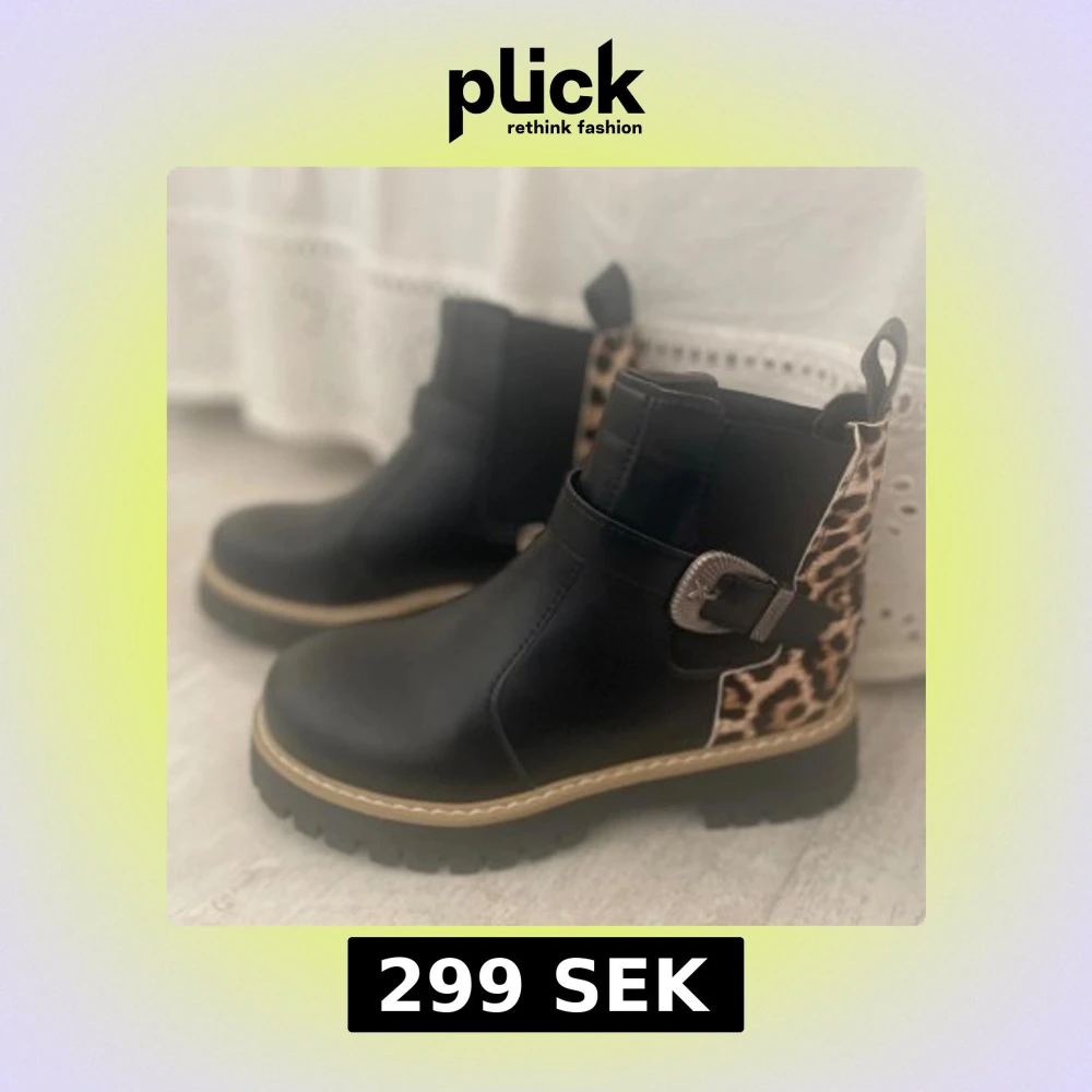Säljer ett par svarta boots med chunky platt sula och rund tå. Baksidan har leopardmönster i bruna och beige toner, samt en snygg metallspänne på sidan. Bootsens ovandel är i syntetmaterial och har dekorativa sömmar runt sulan. Perfekt för dig som gillar att sticka ut.