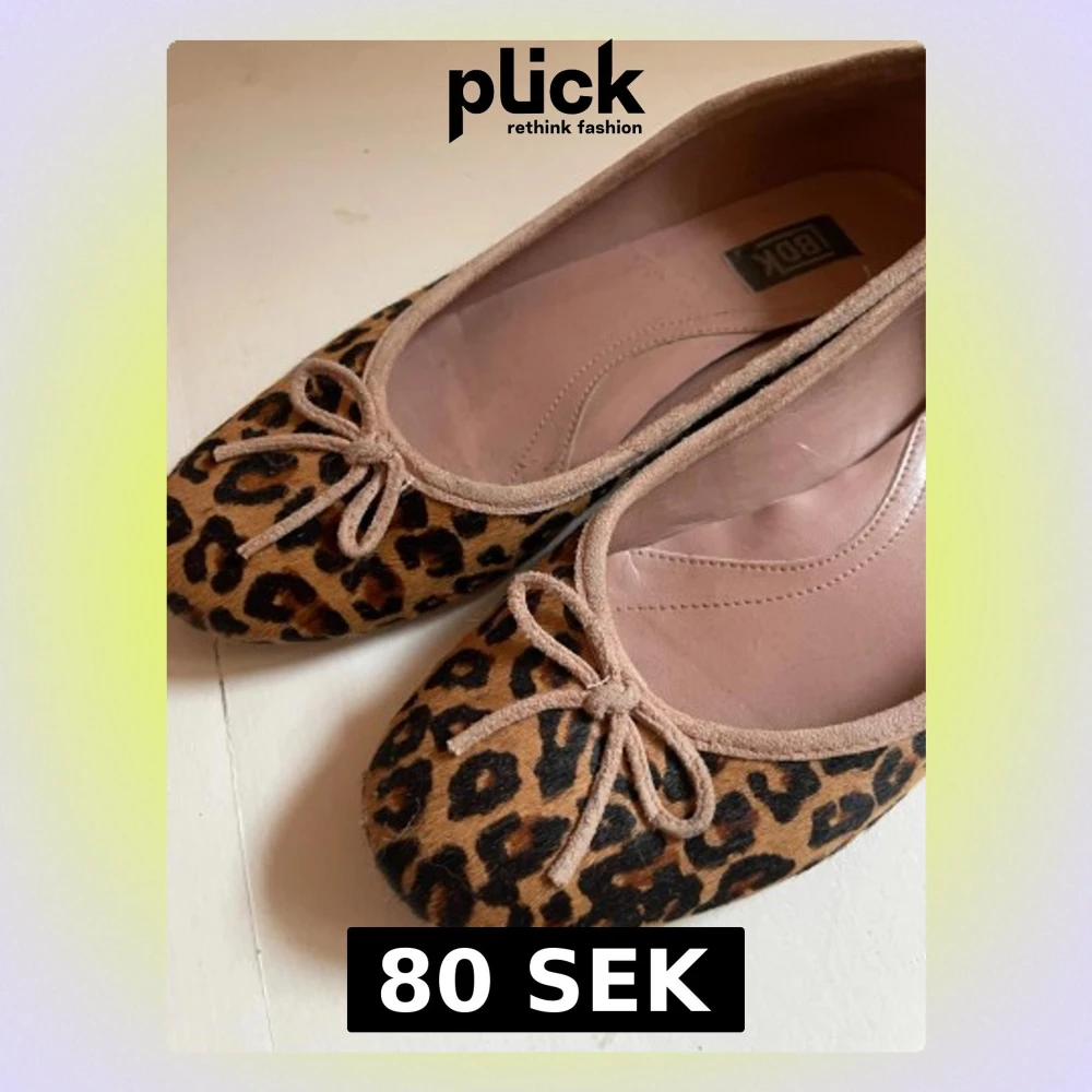 Snygga ballerinaskor, leopardmönster i bruna och svarta toner. Skorna har rund tå, platt sula och en söt rosett framtill. Yttermaterialet har en pälsliknande finish och kanten är beige.