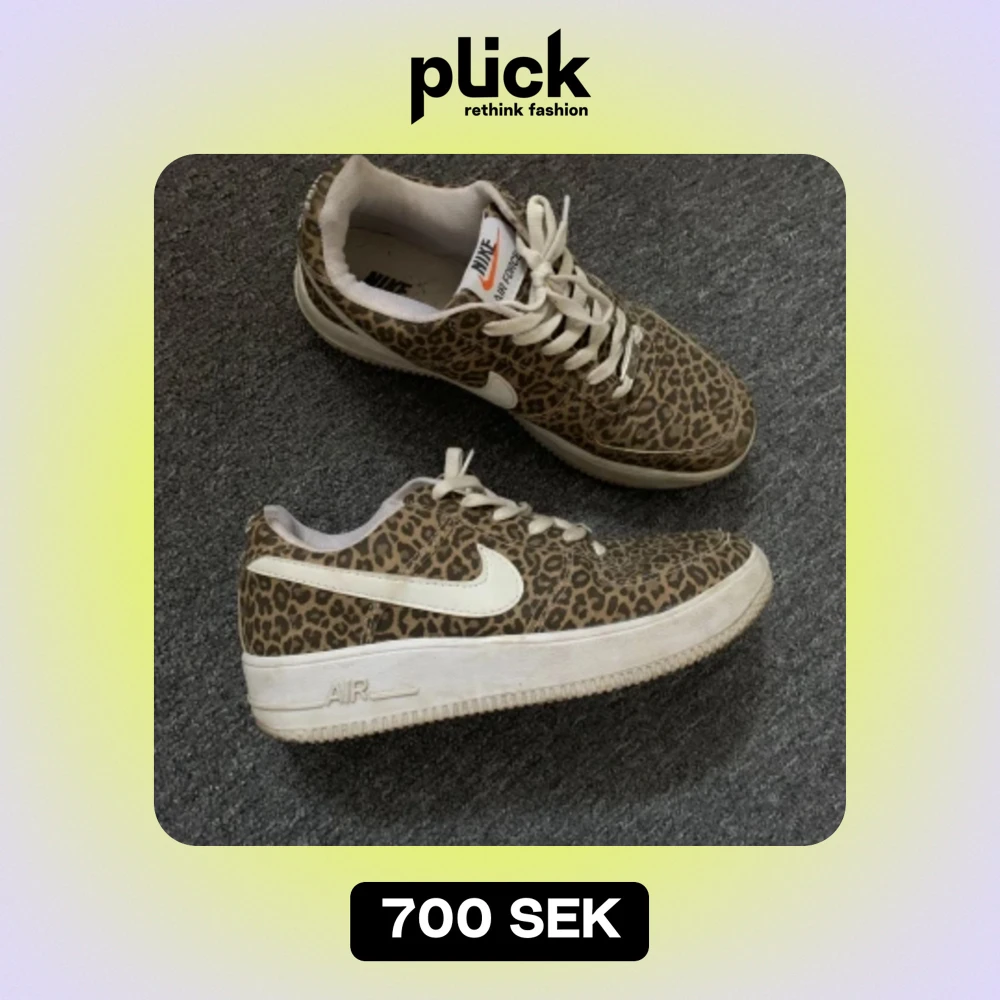 Säljer ett par Nike Air Force 1 med leopardmönster. Skorna har en vit sula och vit Nike-logga på sidan. De är i bra skick. Snörning framtill för en säker passform. De är i storlek 38