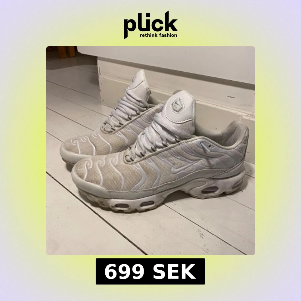 Säljer ett par vita TNs i storlek 44. Skicket är som man ser på bilderna. Jag har inte använt dem många gånger men eftersom de är vita så ser det ut som de. Skriv om fler frågor eller bilder va inte blyg!🫡