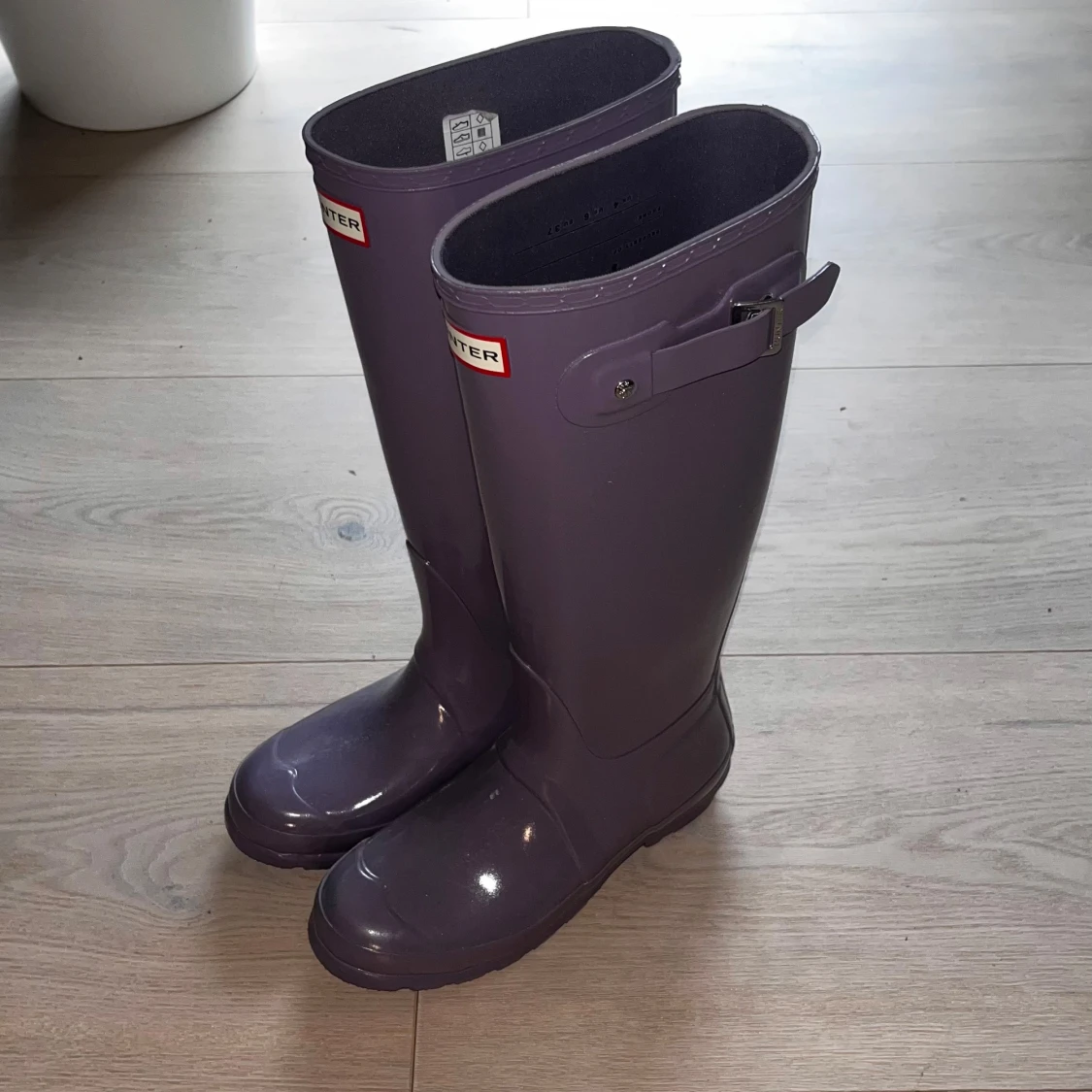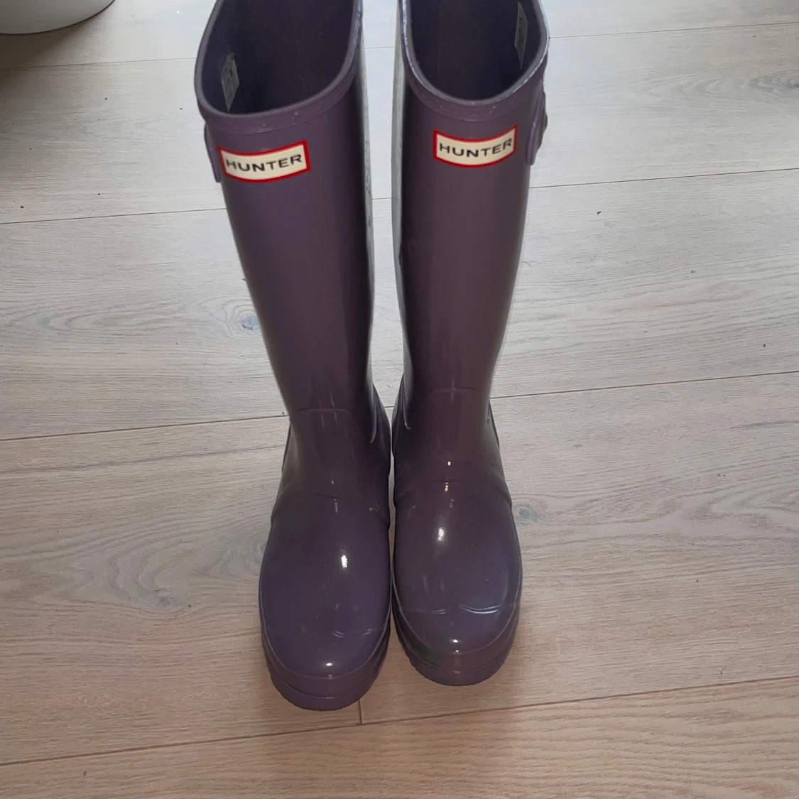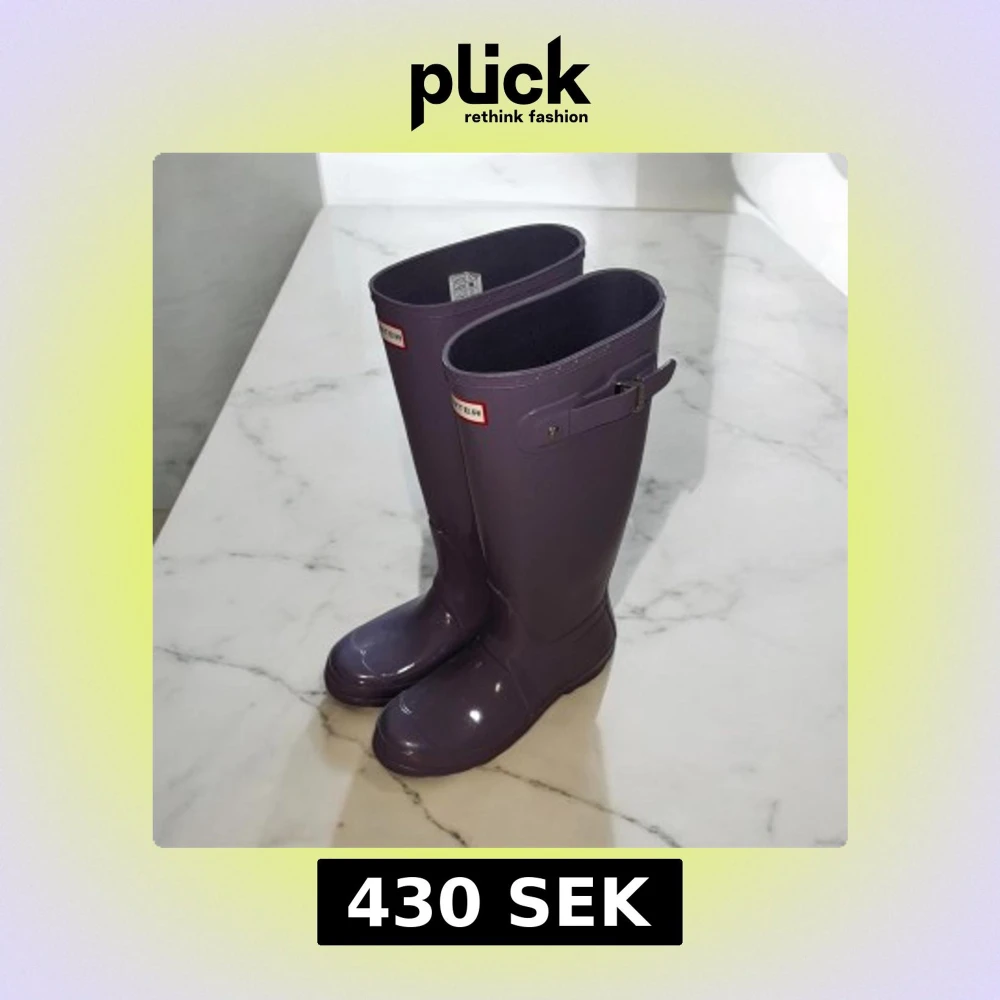 Säljer ett par klassiska lila Hunter stövlar i glansigt gummi. Stövlarna har justerbart spänne på sidan och rund tå. Perfekta för regniga dagar och festivaler. Hunter-logga framtill och mönstrad sula för extra grepp. ‼️Aldrig använda ‼️
