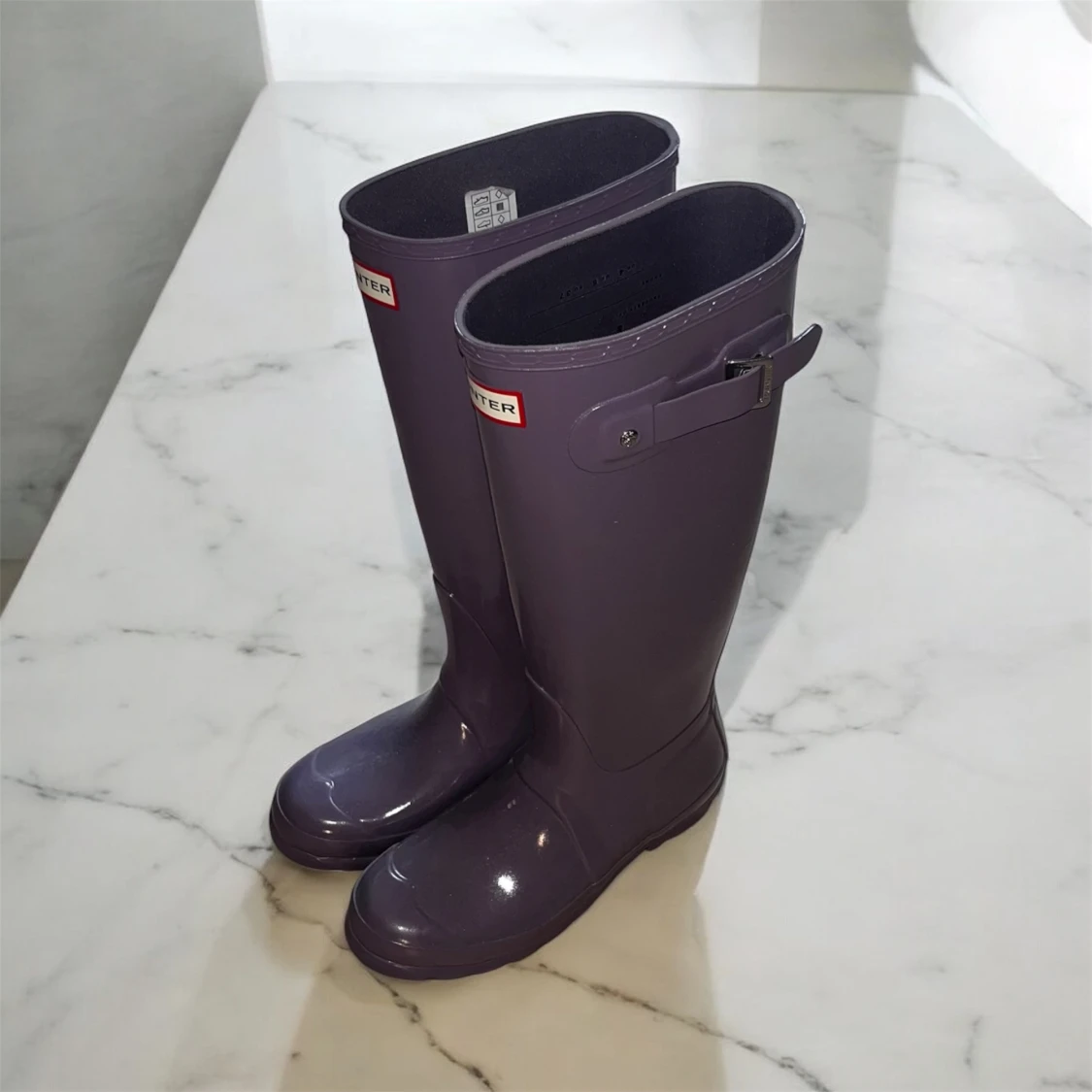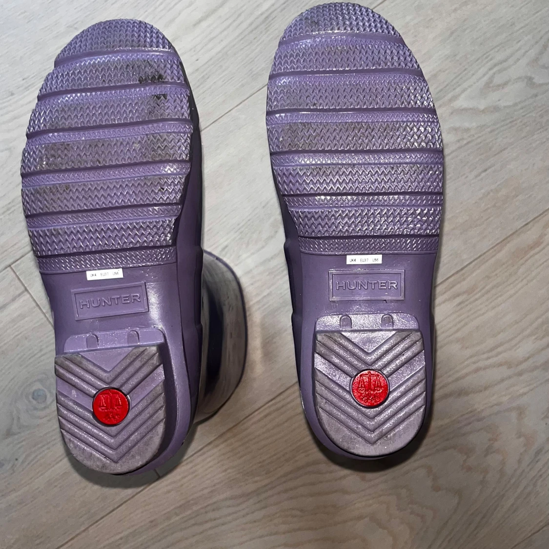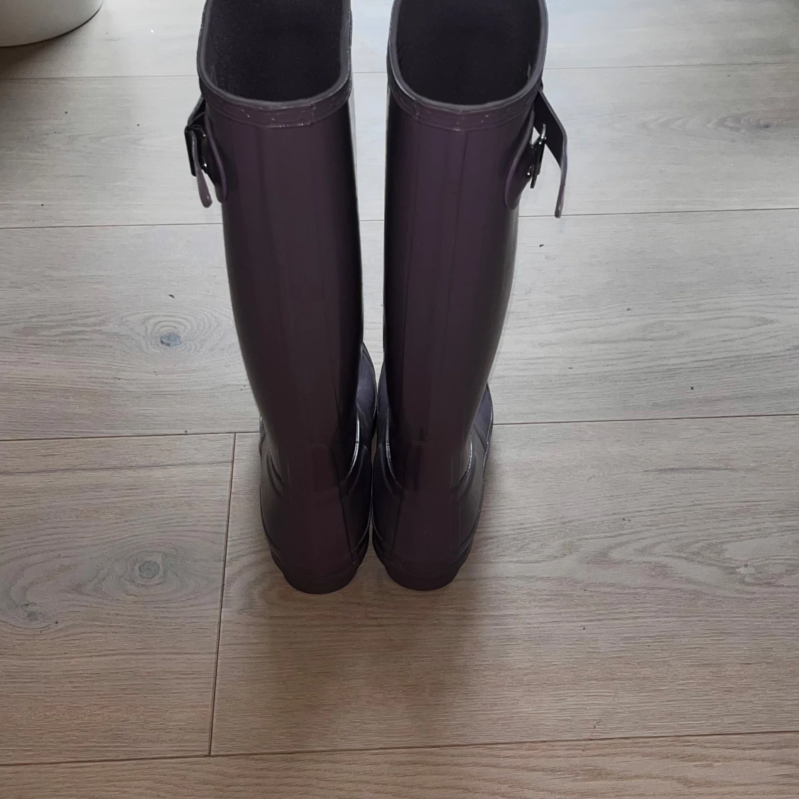 Säljer ett par klassiska lila Hunter stövlar i glansigt gummi. Stövlarna har justerbart spänne på sidan och rund tå. Perfekta för regniga dagar och festivaler. Hunter-logga framtill och mönstrad sula för extra grepp. ‼️Aldrig använda ‼️