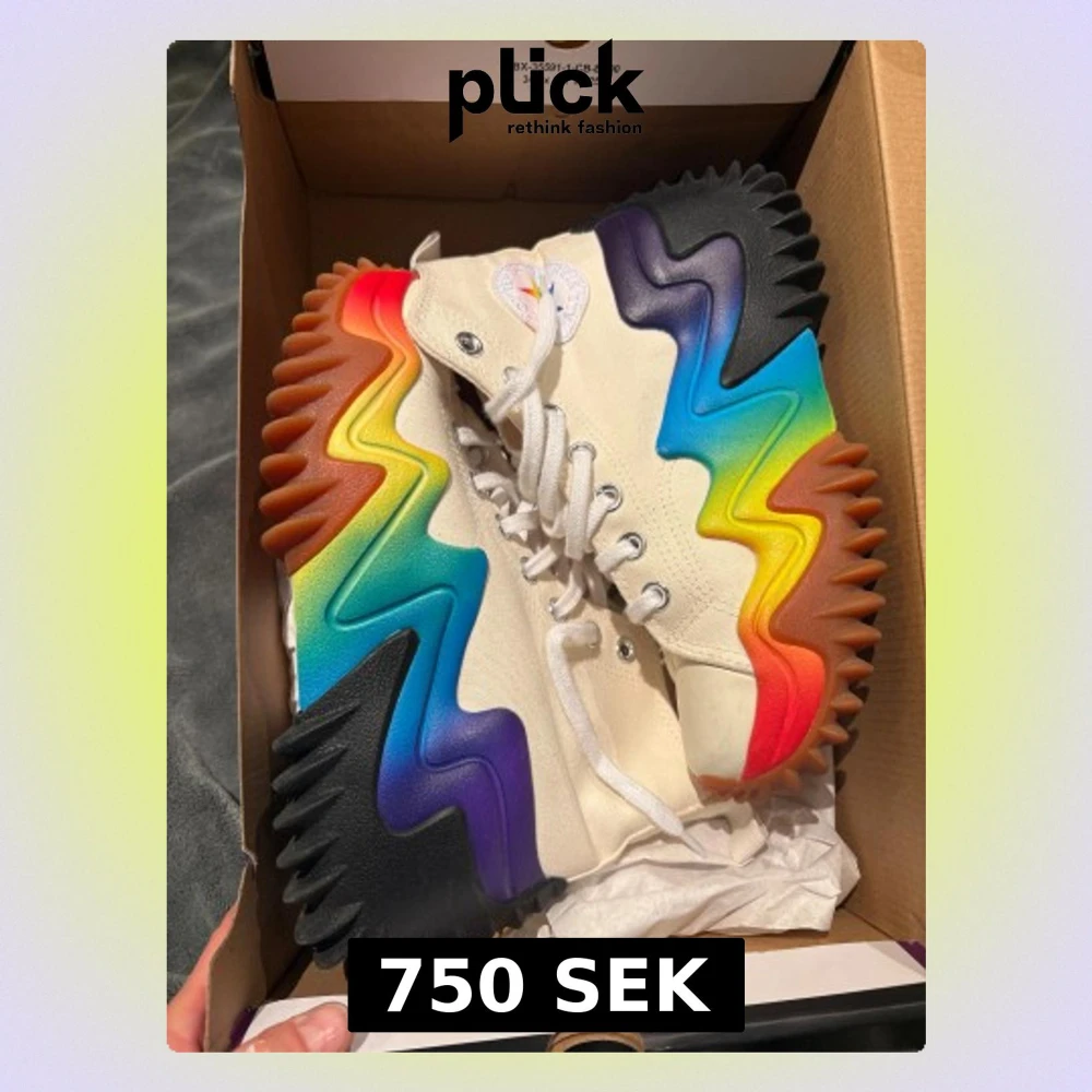 Unika Converse Run Star Motion sneakers i canvas med högt skaft och chunky sula i regnbågsfärger. Skorna har vit ovandel, snörning, regnbågsdetaljer på plösen och Converse-logga med regnbågsstjärna. Sulan är vågig och färgglad med svart, lila, blå, grön, gul, orange och röd. Nya i kartong( innermått23 cm)