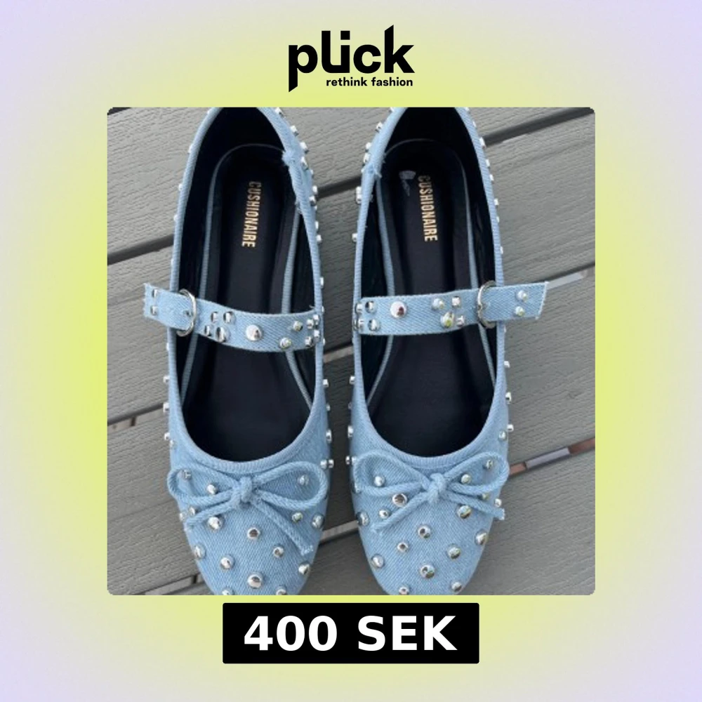Snygga ljusblå ballerinas från Cushionaire i jeansmaterial med silverfärgade nitar och dekorativ rosett framtill. Skorna har en rem över foten med spänne och rund tå. Ej använda men finns lite slitning på sidan av skorna på bild fyra