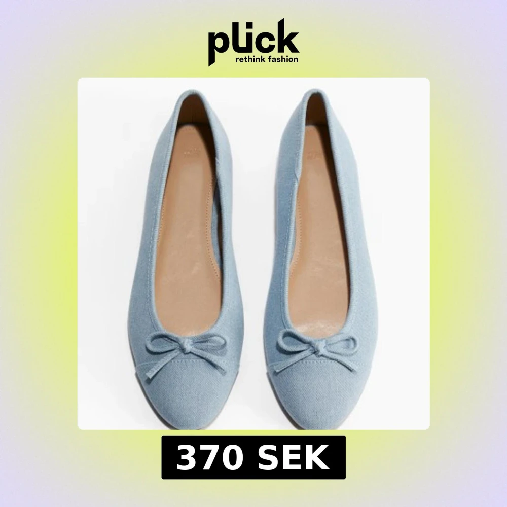 Söta ljusblå ballerinaskor från H&M med rund tå och liten rosett framtill. Som ör slutsåld säljer då den ej passa mig så den är endast använd en gång.