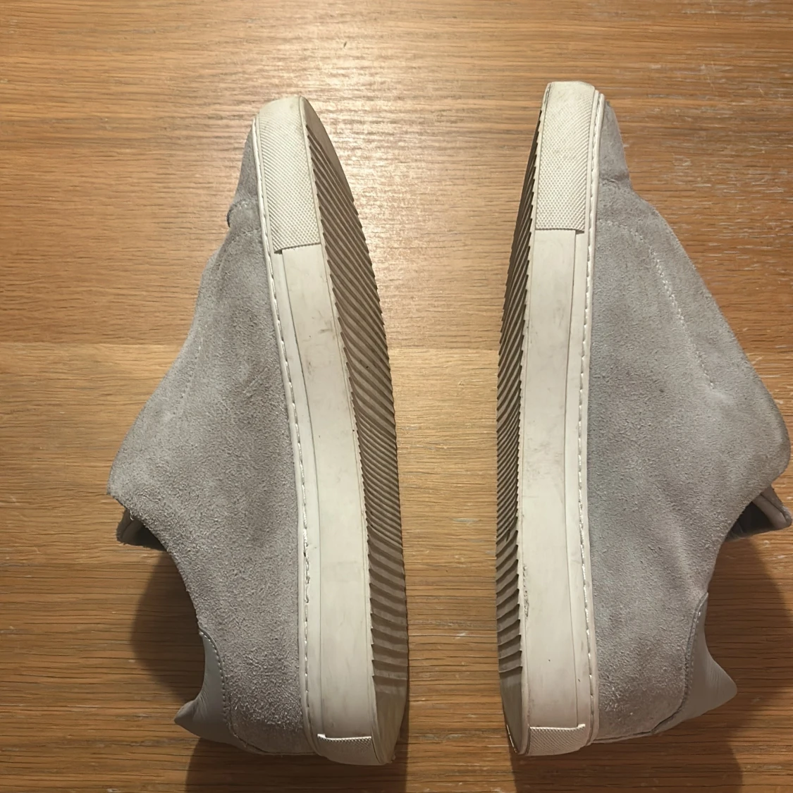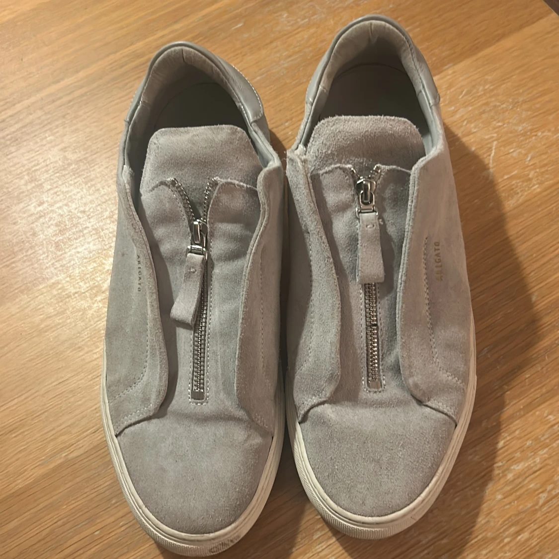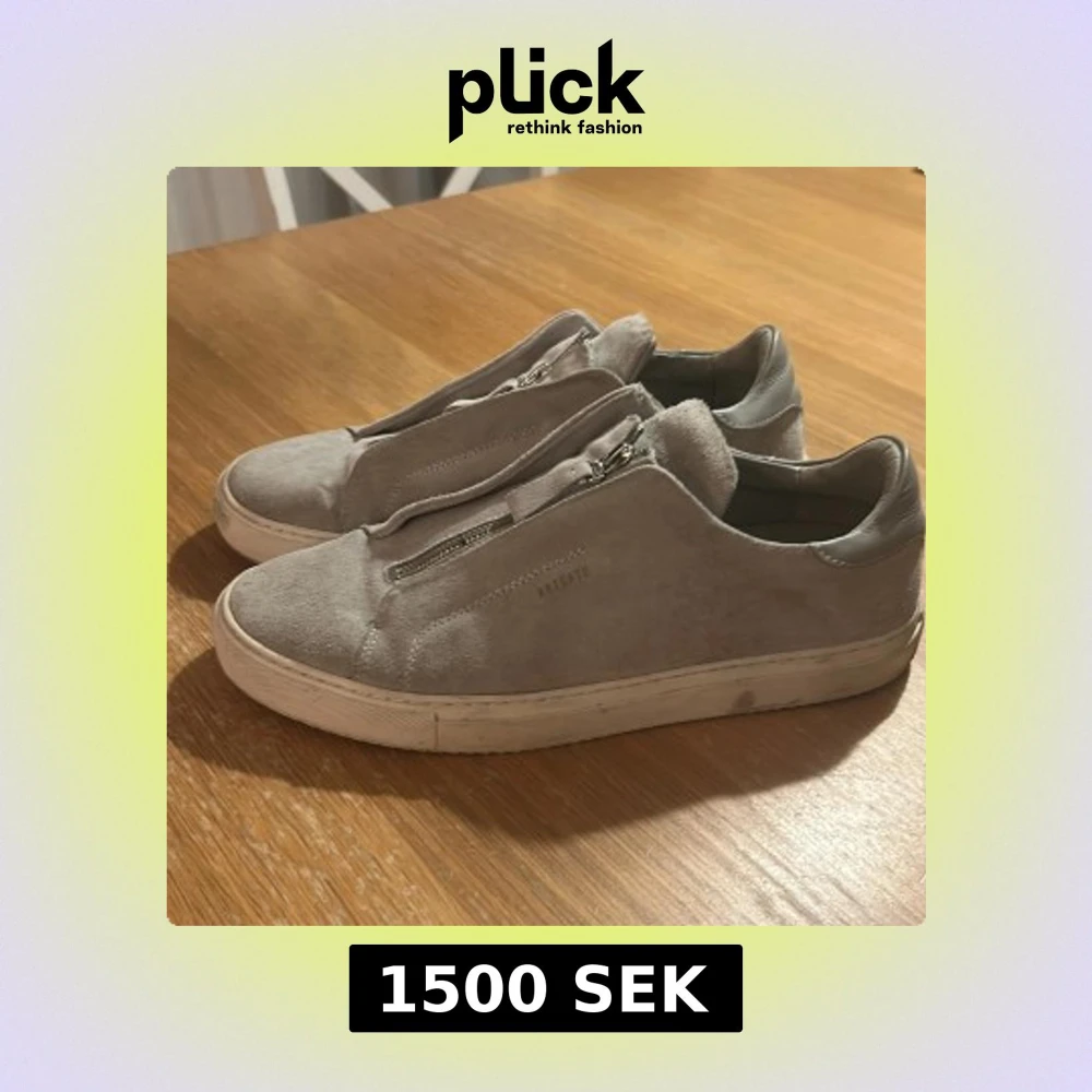 Säljer ett par ljusgrå sneakers från Axel Arigato i mocka med dragkedja. Skorna har rund tå och vit platt sula, perfekt för en clean och stilren look. Vid frågor eller funderingar är det bara att höra av sig! Tvättas innan frakt!