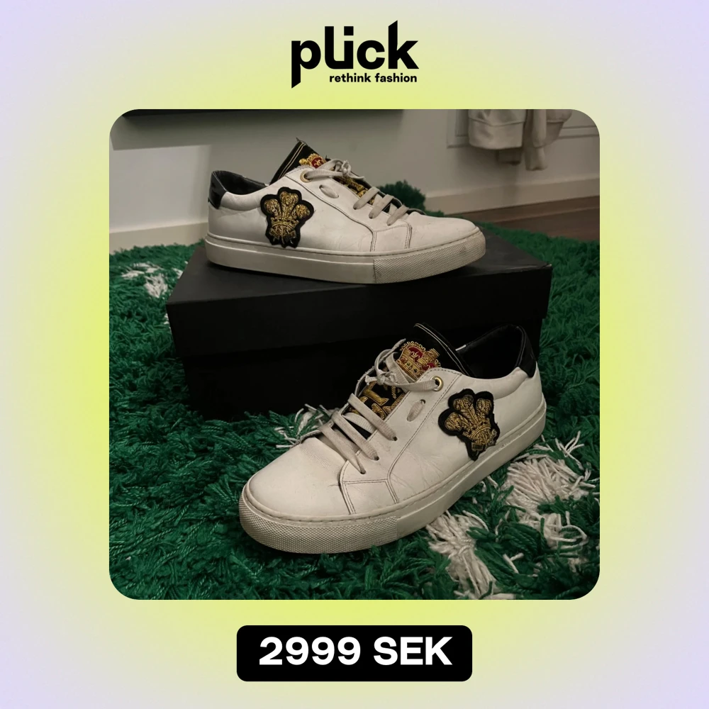 Säljer ett par vita sneakers från Lords & Fools i bra skick. Skorna har snygga broderade detaljer i guld och svart på sidan och tungan. De är tillverkade i skinn och har en klassisk snörning. Perfekta för både vardag och fest! (Ny pris: 5500)