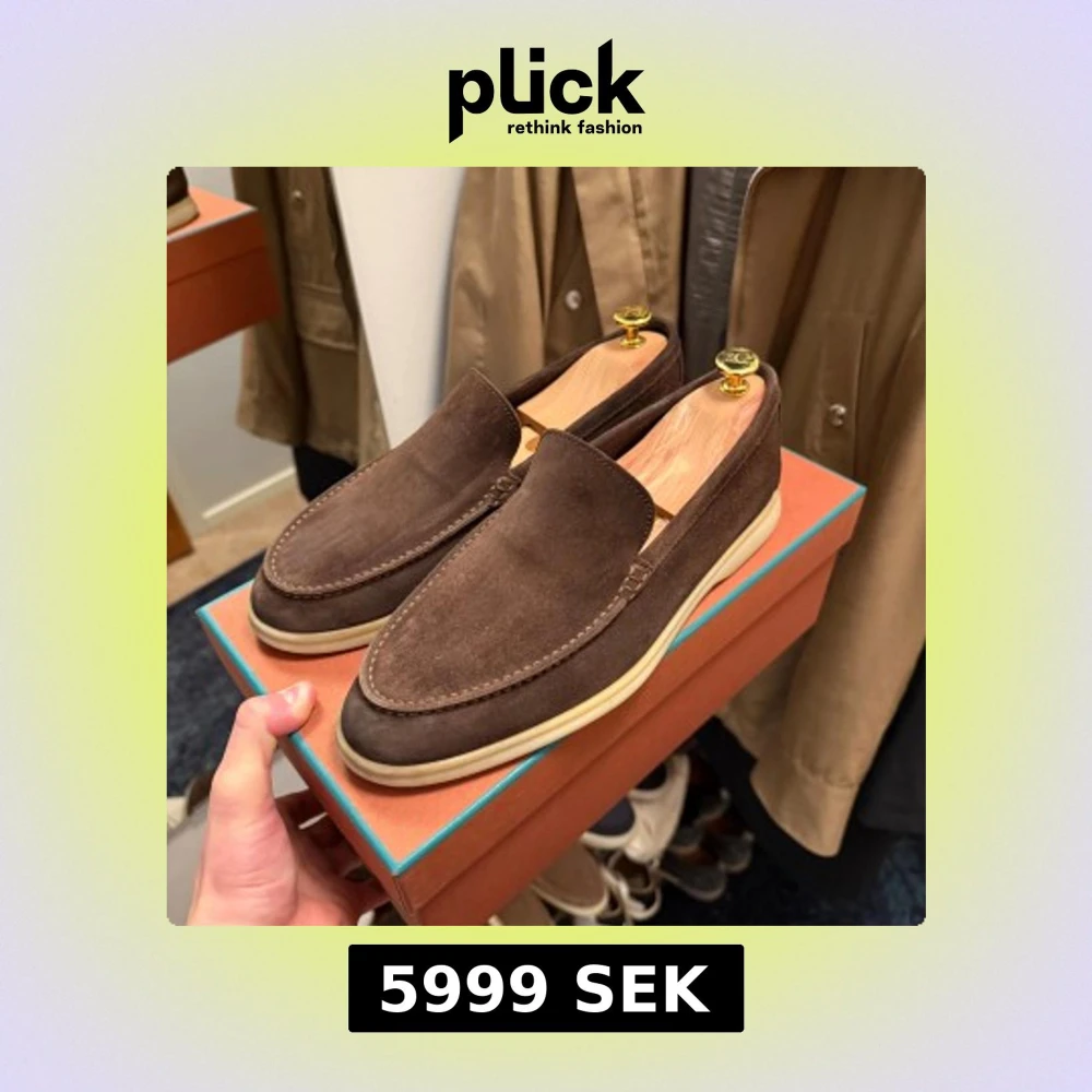 Snygga SW från Loro Piana i brun mocka med rund tå och platt ljus sula. Skorna har stilren design utan snörning och är perfekta för dig som gillar klassisk och avslappnad stil. Insidan är mjuk och bekväm, och de passar lika bra till jeans som till chinos. Allt OG följer med box två dust bags