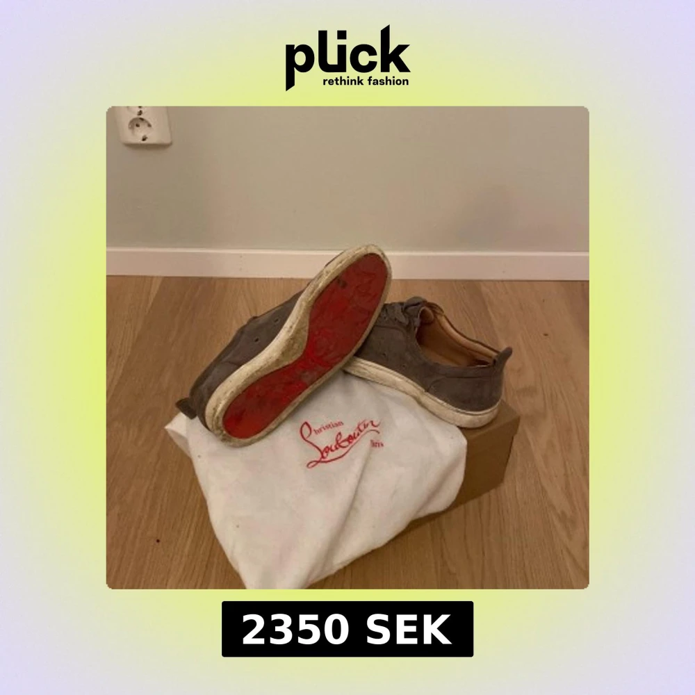 Säljer ett par gråa sneakers från Christian Louboutin i mocka med klassisk röd sula. Skorna har snörning, rund tå och vita sulor. Insidan är i beige skinn och de har en stilren, clean look som passar till det mesta. Säljer för 2350 men priset kan altid diskuteras, hör av er vid minsta fråga Elr fundering!