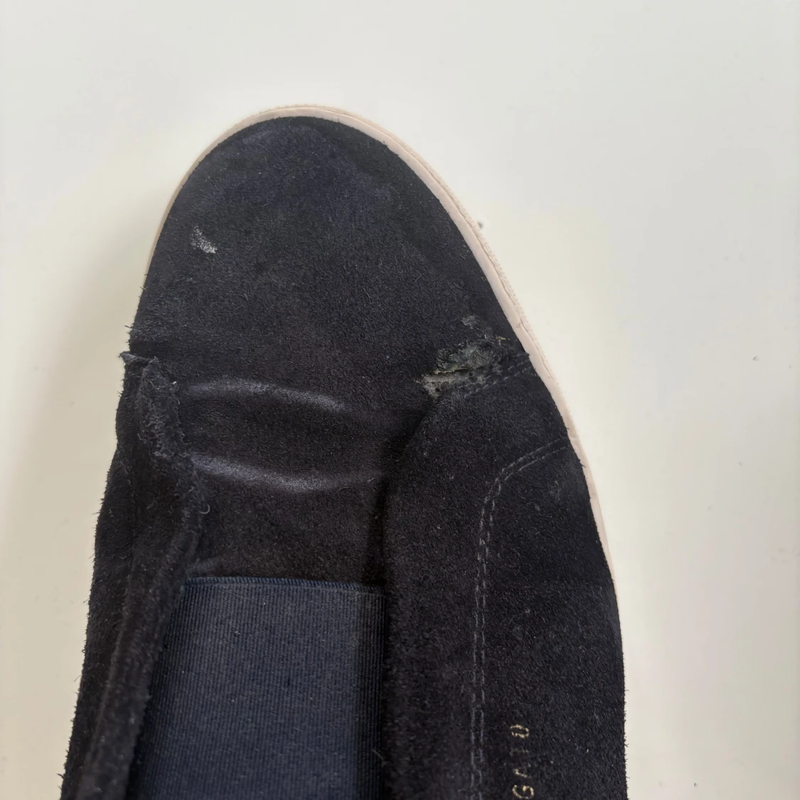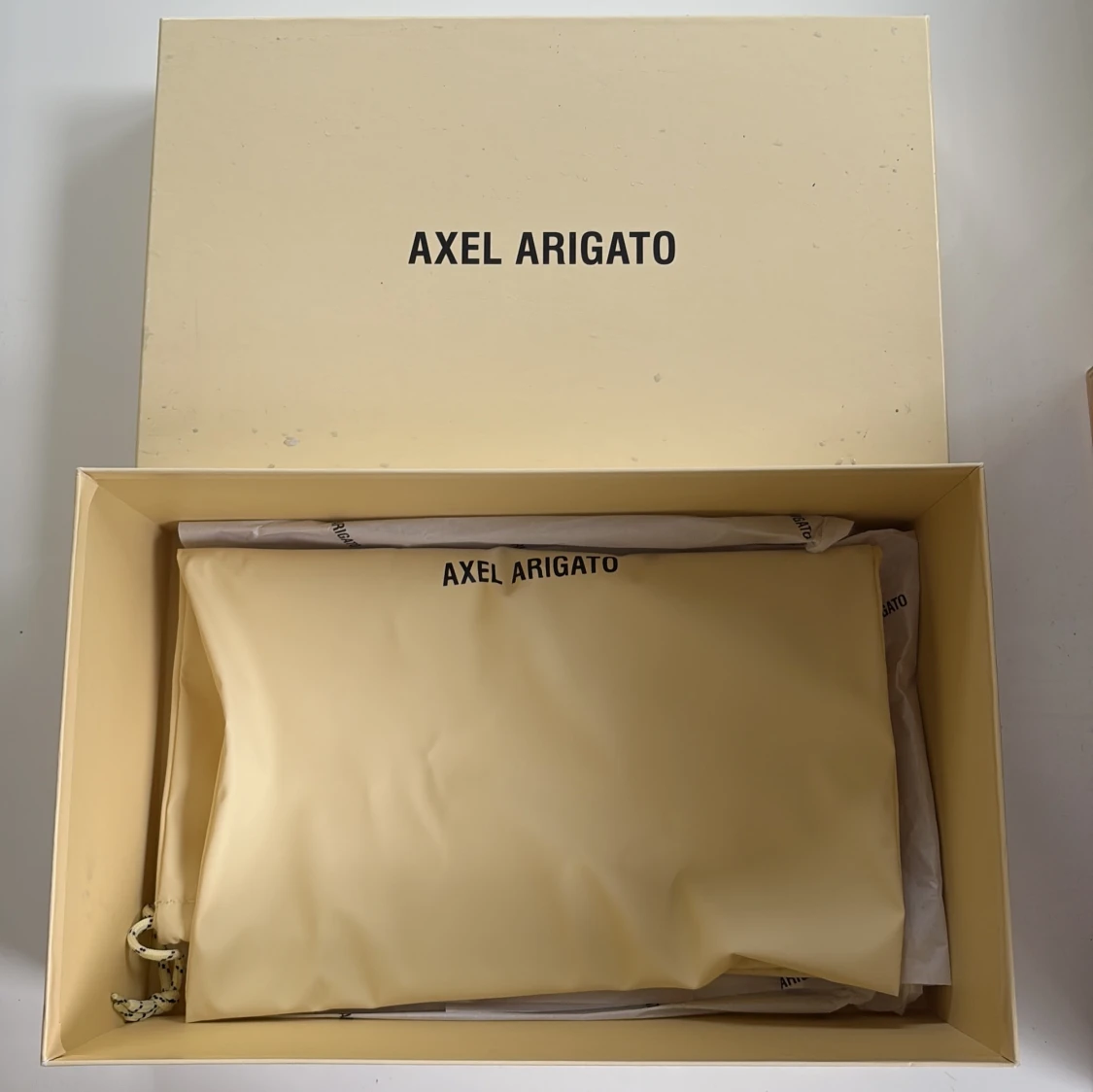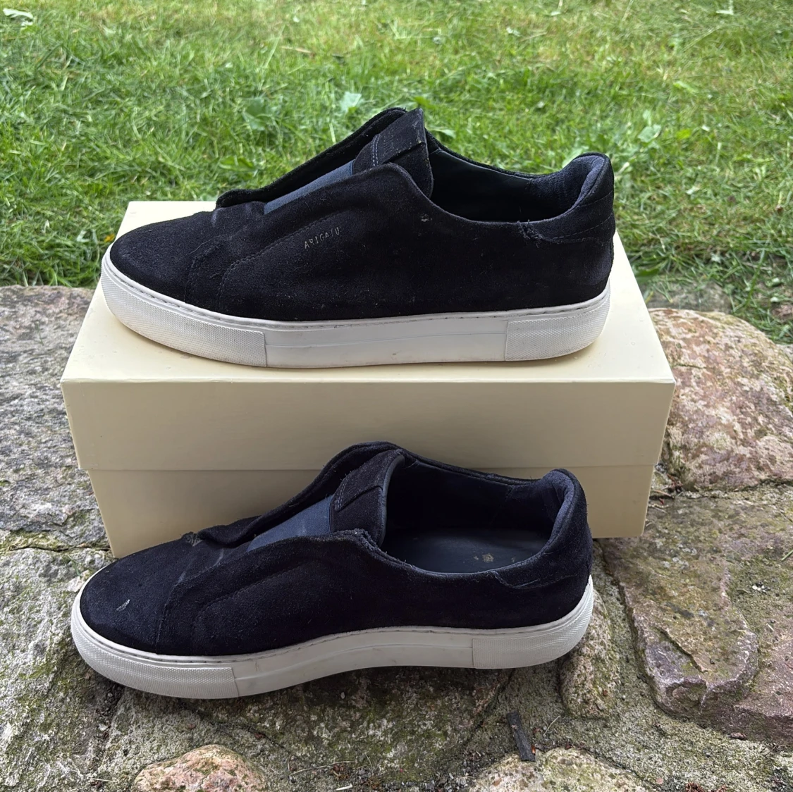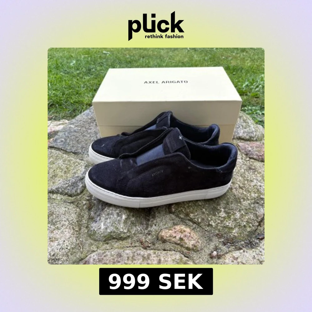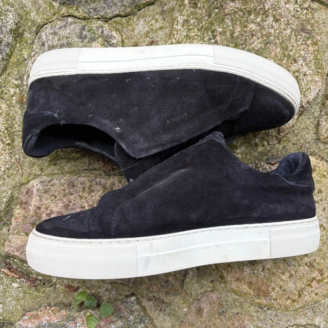 Stilrena svarta sneakers från Axel Arigato i mjuk mocka med vit platt sula. Skorna är sällsynta, då de inte säljs längre. Perfekta för dig som gillar en clean och modern look. Liten slitning på höger sko, inget man tänker på. Box och påse medföljer!