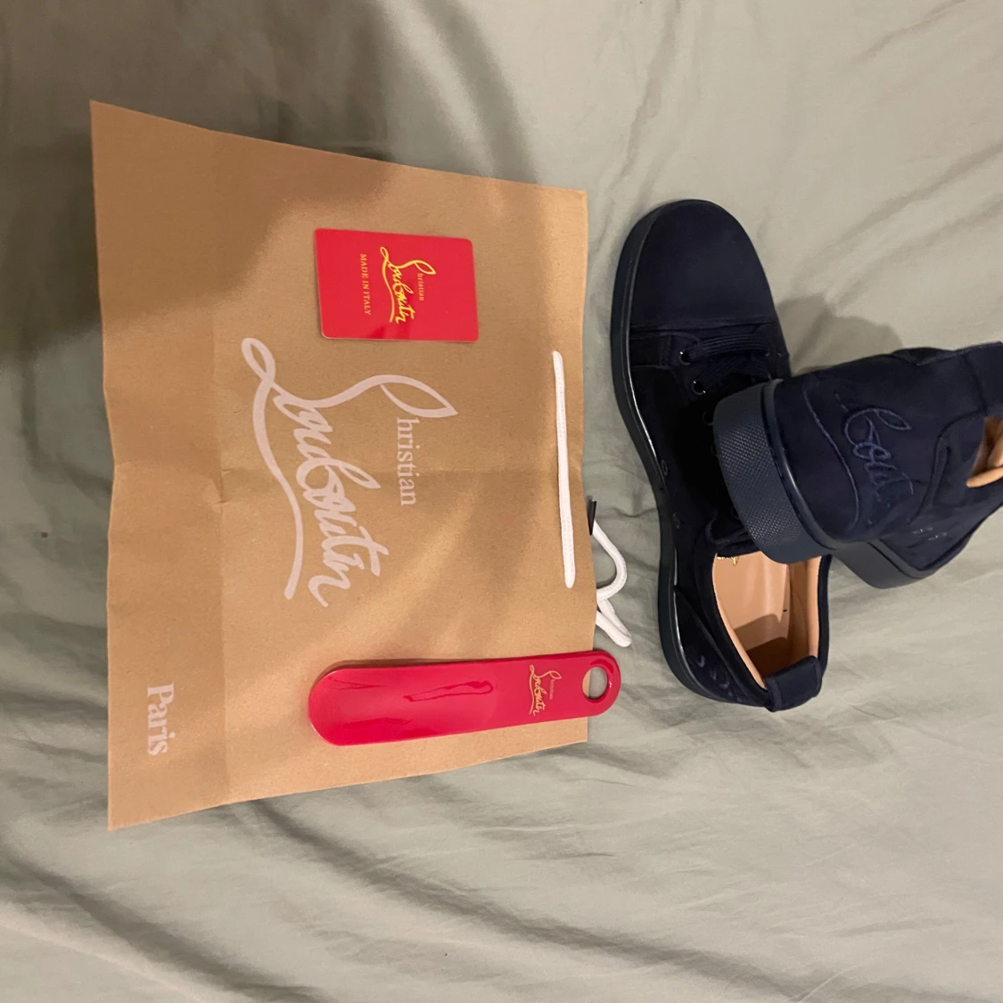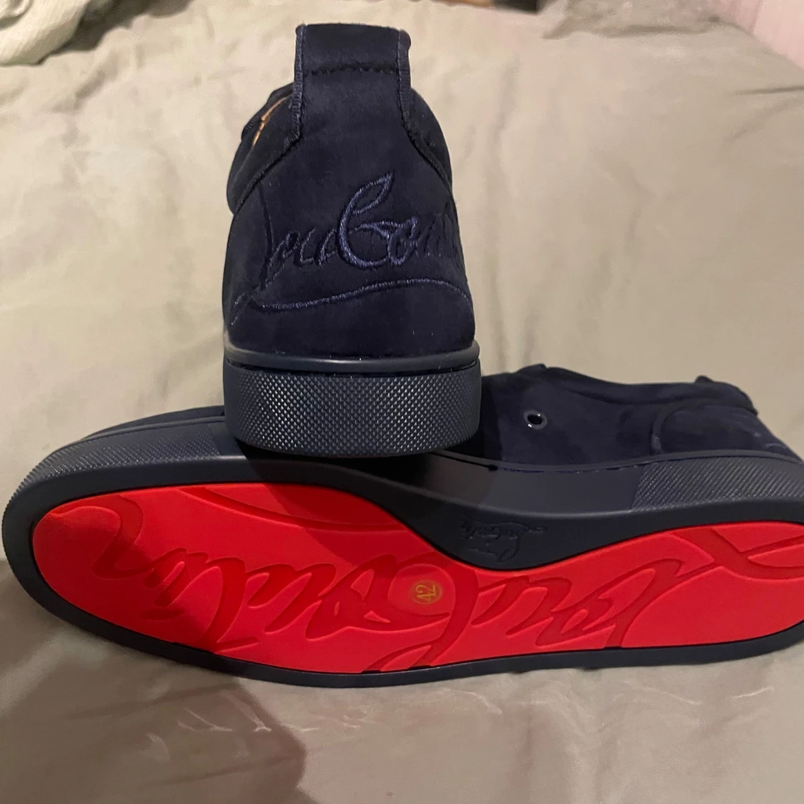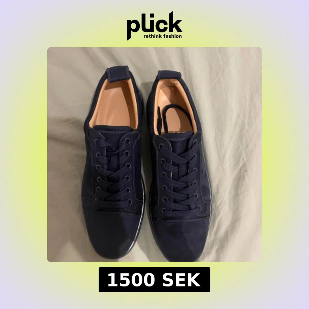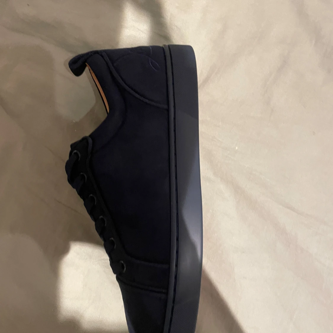 Snygga mörkblå sneakers från Christian Louboutin i mocka med klassisk röd sula och broderad logga på hälen. Skorna har rund tå, platt sula och snörning. Perfekta för dig som vill sticka ut med exklusiva detaljer och lyxig känsla. Skolåda finns att få med.