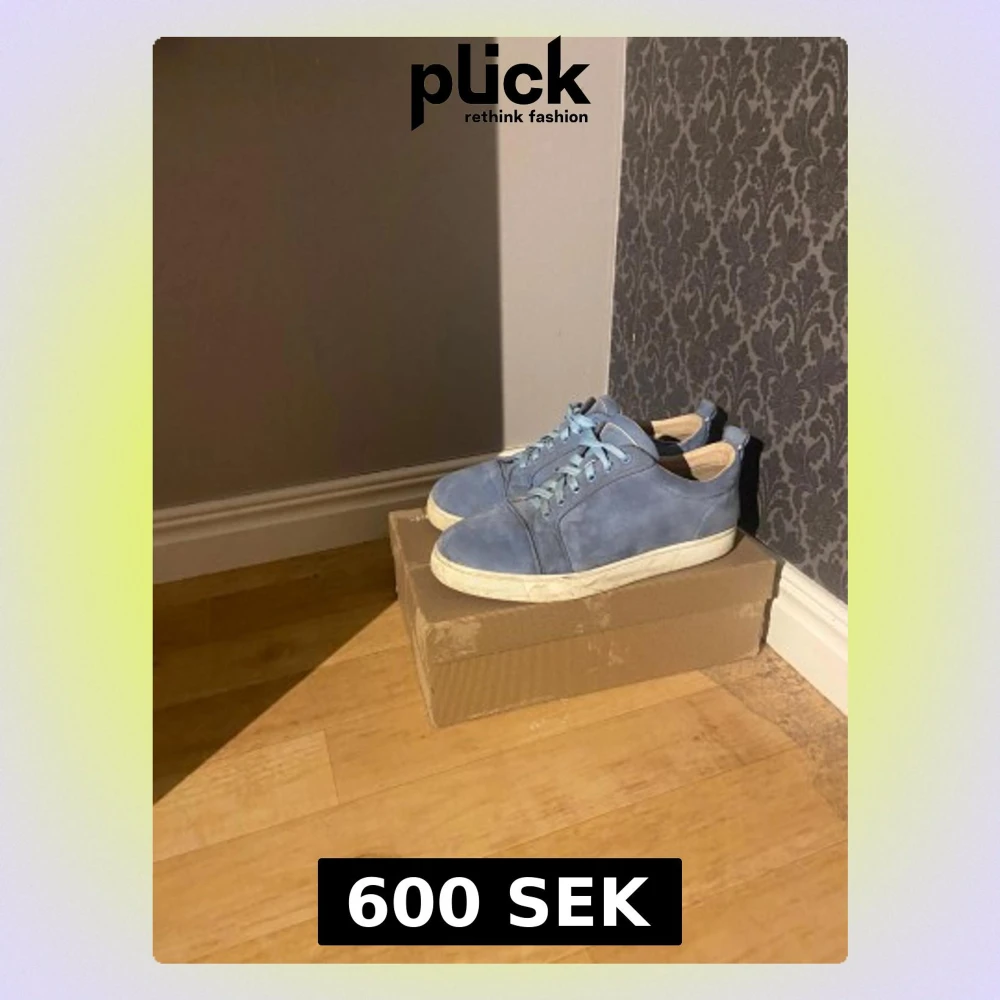 Snygga blå sneakers i mocka från Christian Louboutin med klassisk röd sula och rund tå. Skorna har snörning och vit platt sula, vilket ger en clean och modern vibe. Perfekt för dig som vill sticka ut med exklusiva detaljer och lyxig känsla.