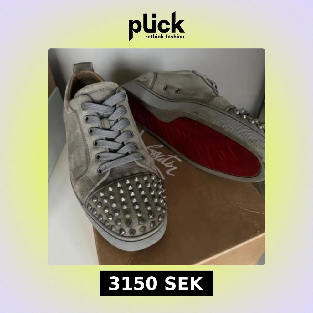 Säljer ett par gråa Louis Junior Spikes Orlato från Louboutin i mocka med coola metalldetaljer och nitar framtill. Skorna har klassisk röd sula, grå snörning och lyxig läderinsida. Perfekta för dig som vill sticka ut med exklusiva sneakers. Fint skick men väl använda, tts, og all med ordersbekräftelse från Vestiaire collective.