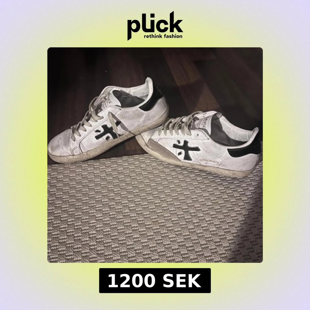 Snygga vita sneakers från Premiata med svarta detaljer och snörning. Perfekta för en stilren look. Skorna har en klassisk design med en bekväm passform. Skolan är i begnagnat skick och respektive häl är skadad (se bild 5). Box medföljer!