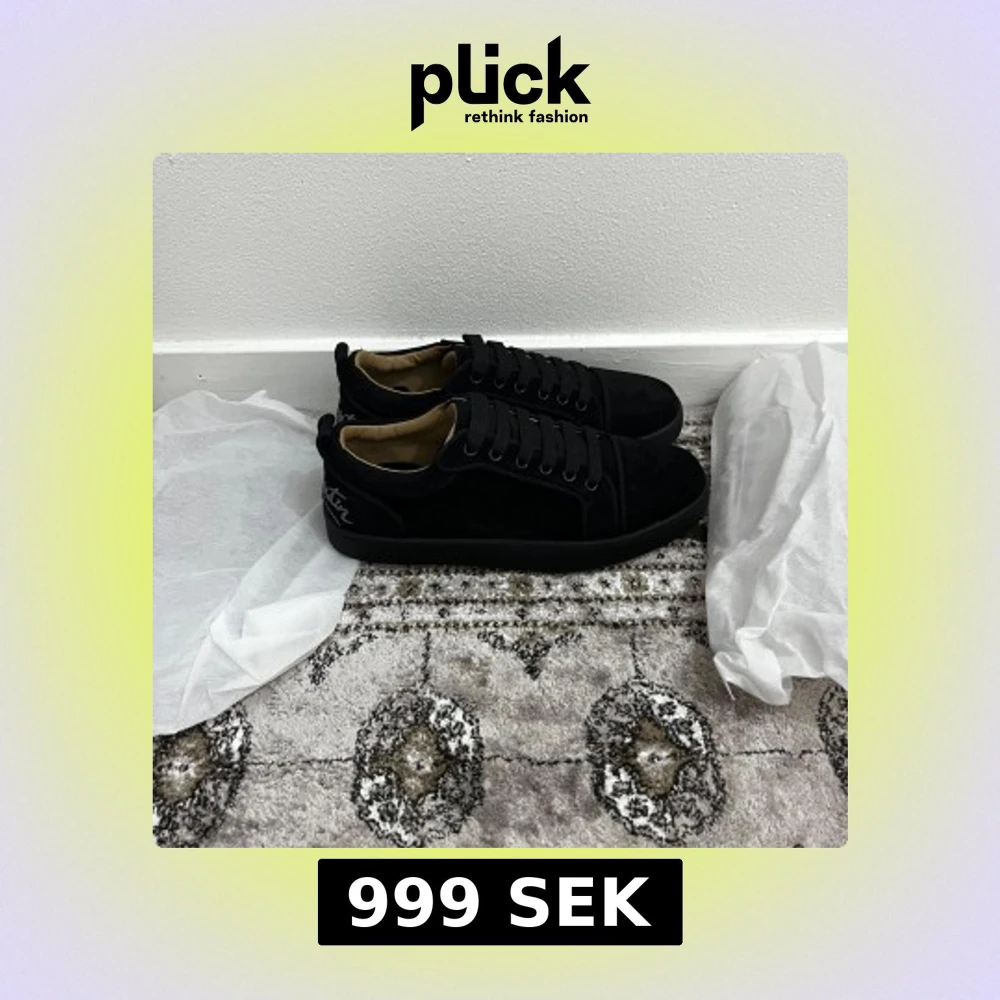 Snygga svarta sneakers från Louboutin i mjuk mocka med klassisk röd sula och broderad logga på hälen. Skorna har rund tå, platt sula och svarta snören. Perfekta för dig som vill ha en stilren och lyxig look med streetkänsla.