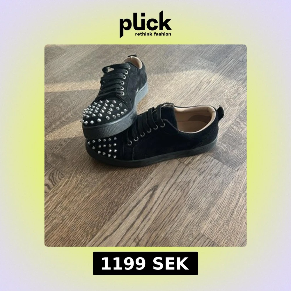 Svarta Louboutin skor i mocka med platt sula och rund tå. Skorna har snörning och är dekorerade med silvriga nitar över tån för en edgy look. Perfekta för dig som vill sticka ut med din stil. Insidan är ljusbeige och sulan är svart.