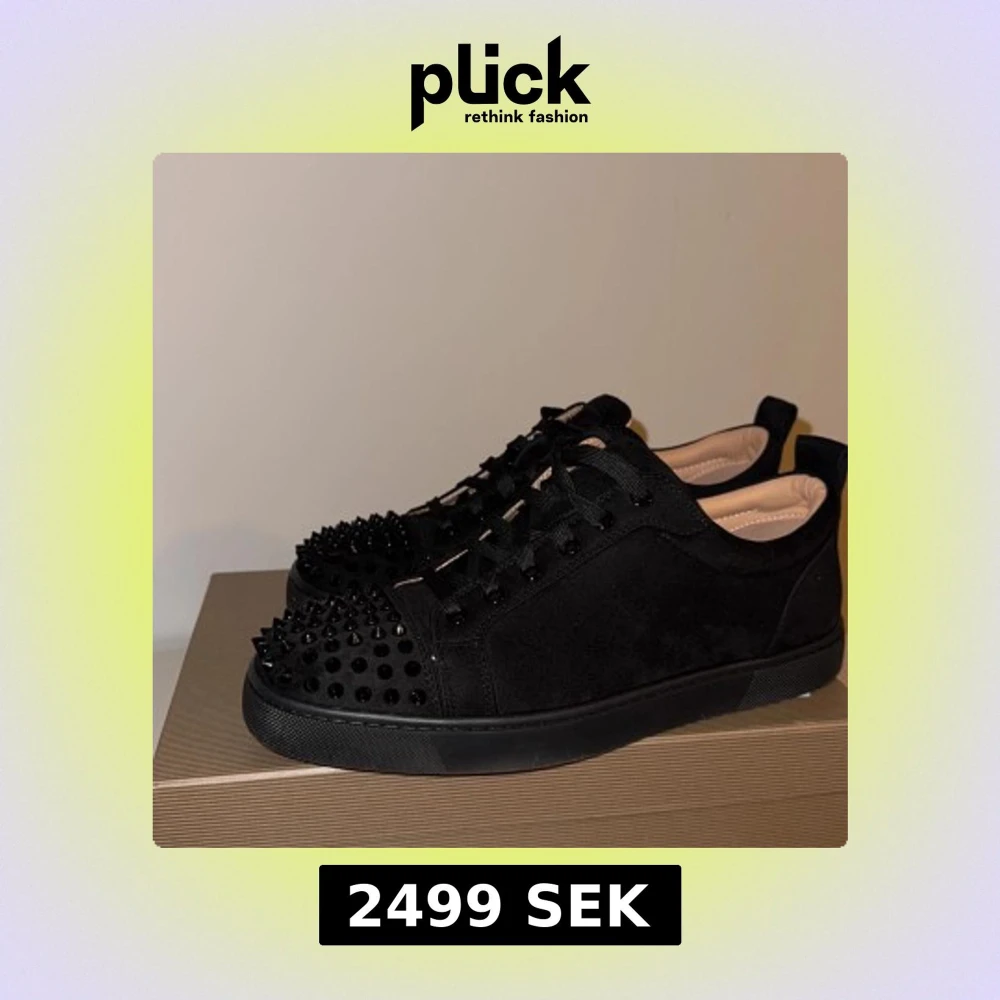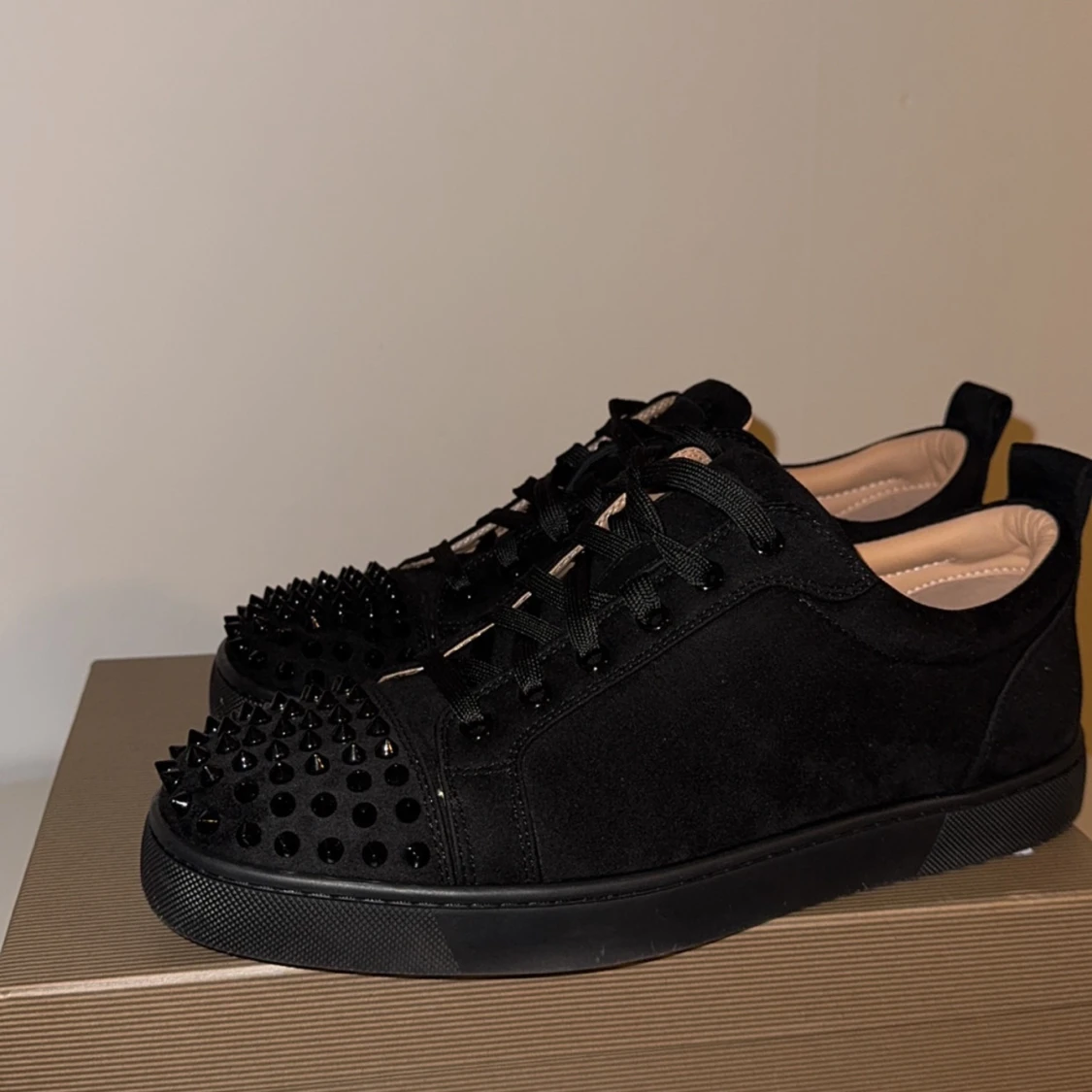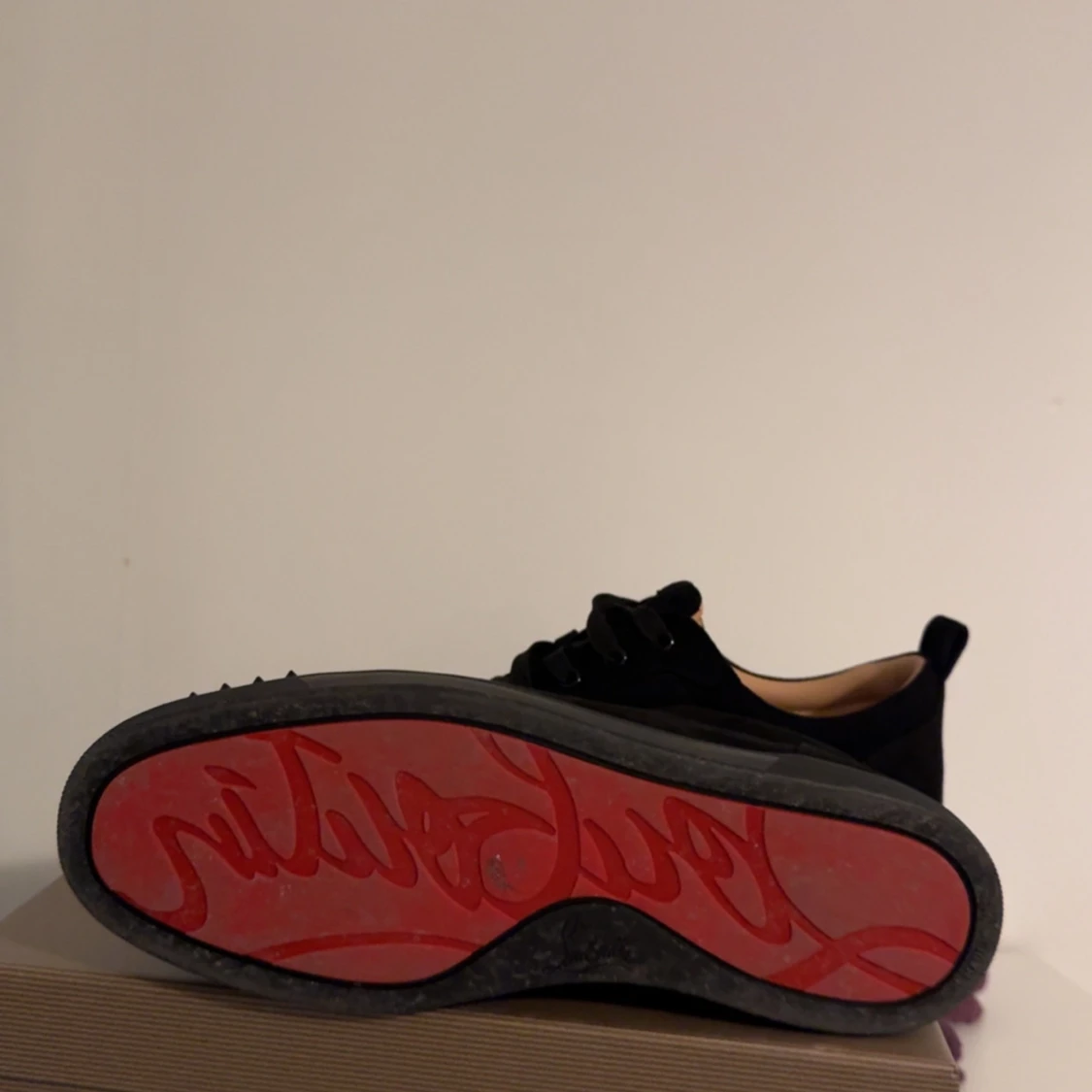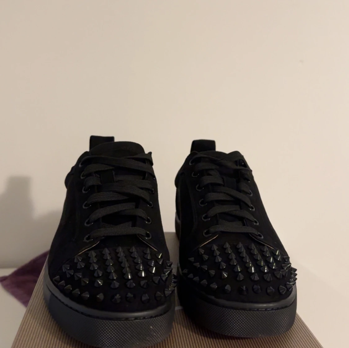 Snygga svarta louboutins.Skorna har en röd sula med ett märke ingraverat. De är tillverkade i mocka och har snörning framtill.