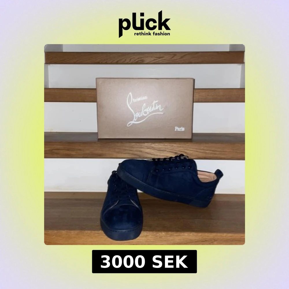 Snygga mörkblåa sneakers från Christian Louboutin i mocka med den ikoniska röda sulan. Skorna är i perfekt skick och en stilren design som passar perfekt för en trendig look. Skorna är använda endast ett fåtal gånger. Tveka inte för minsta fråga!