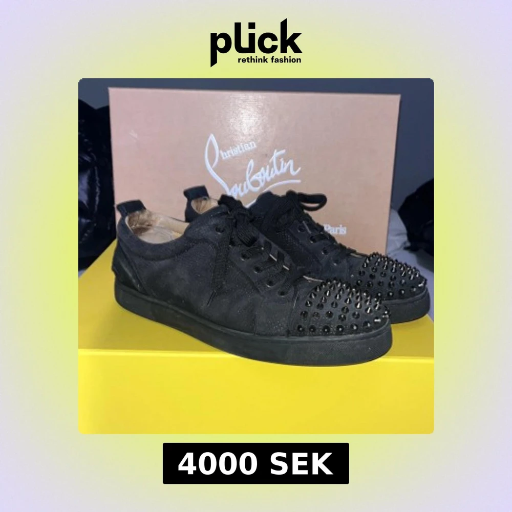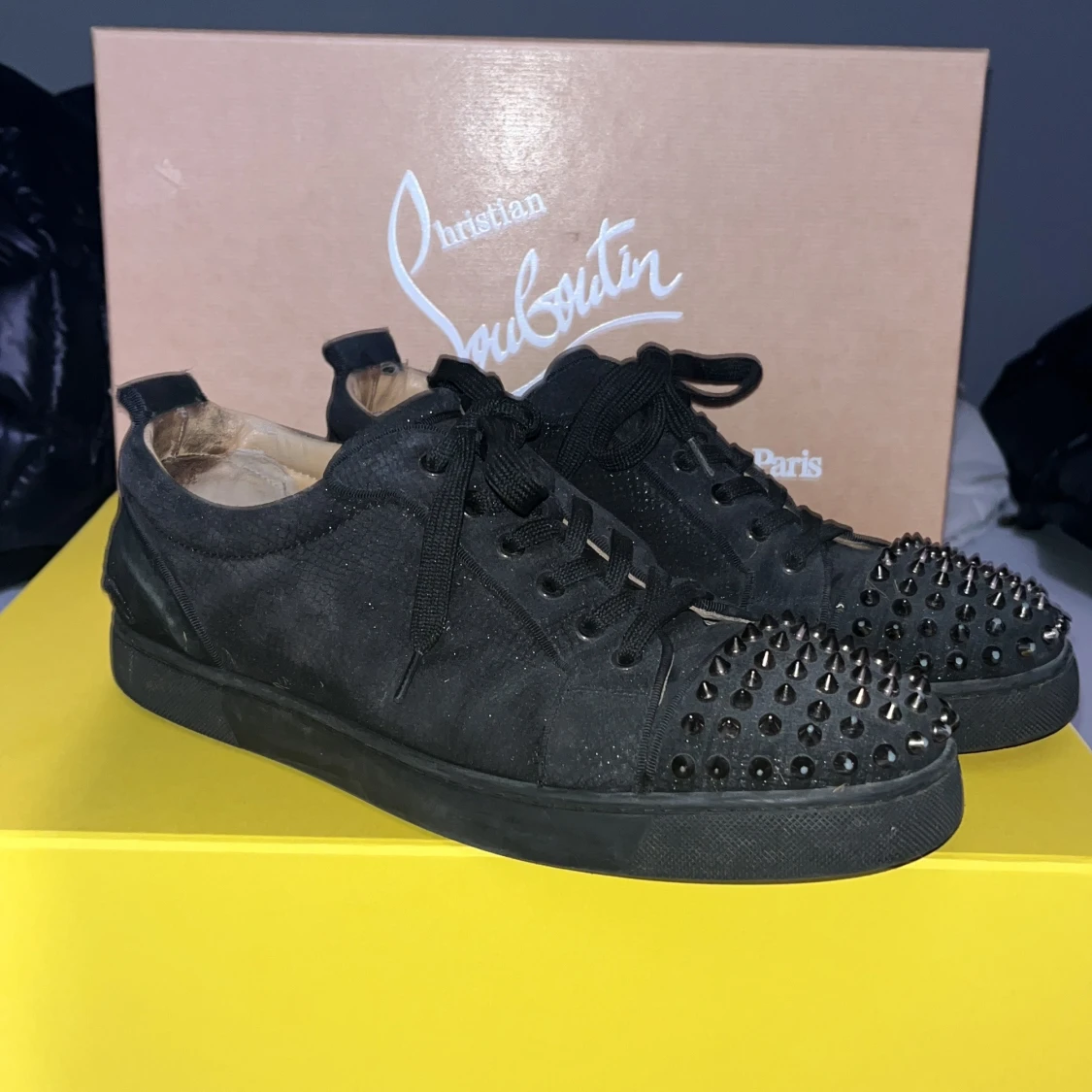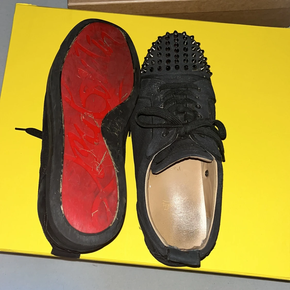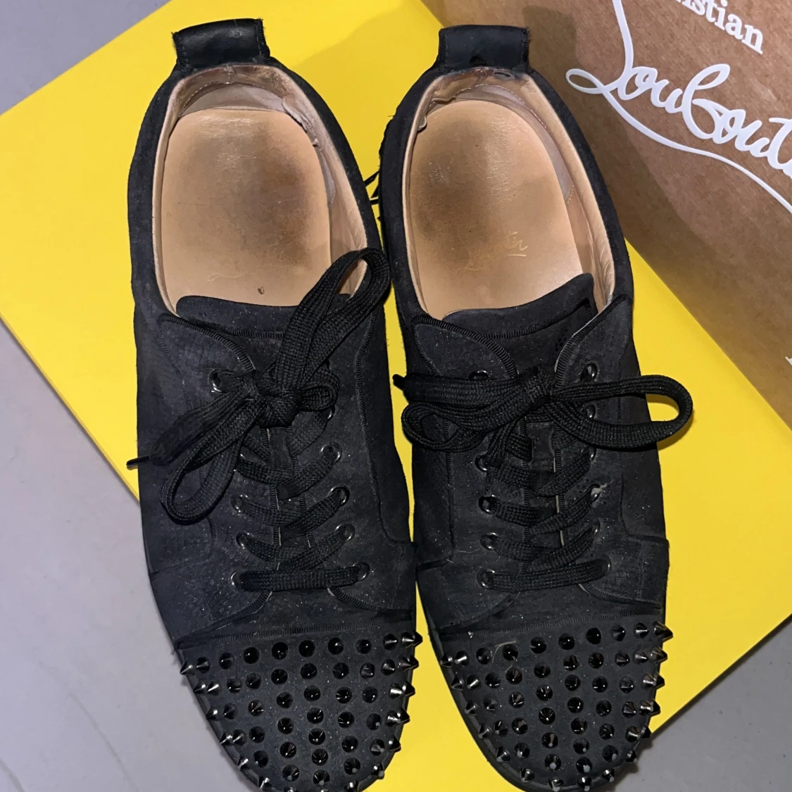 Svarta sneakers från Christian Louboutin i mocka med coola svarta nitar på tån och klassisk röd sula. Skorna har snörning och en platt sula, perfekt för dig som vill sticka ut med en edgy vibe. Snygg och unik design som verkligen drar blickarna till sig.