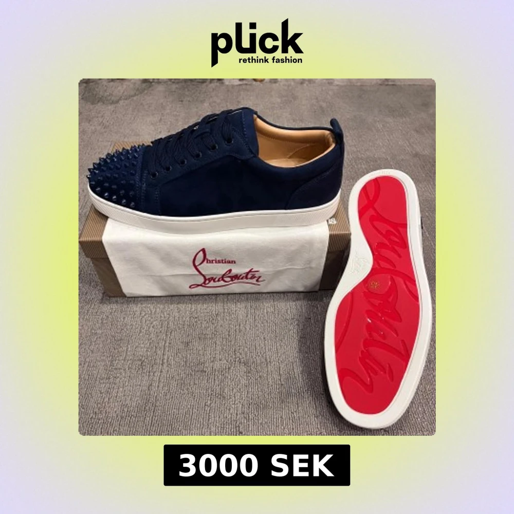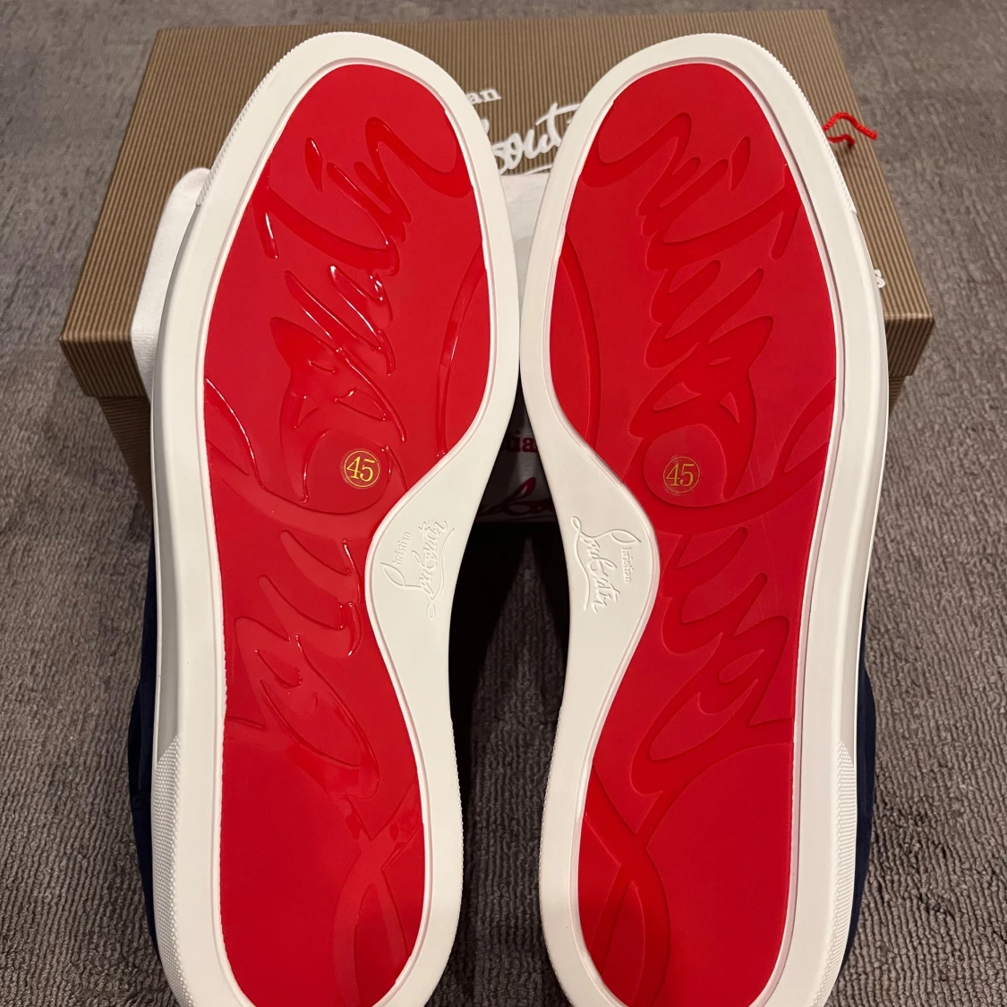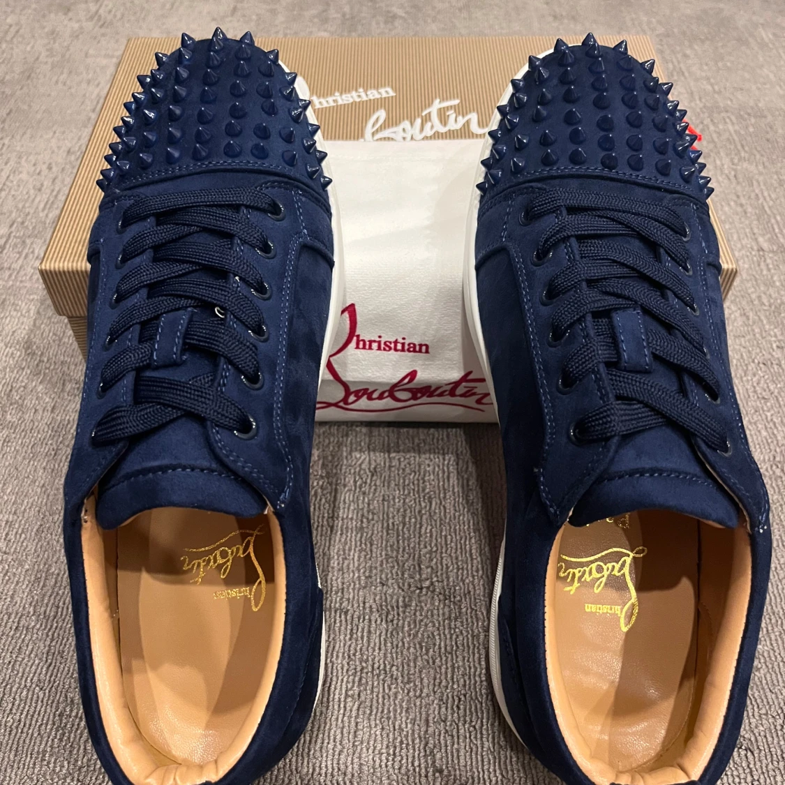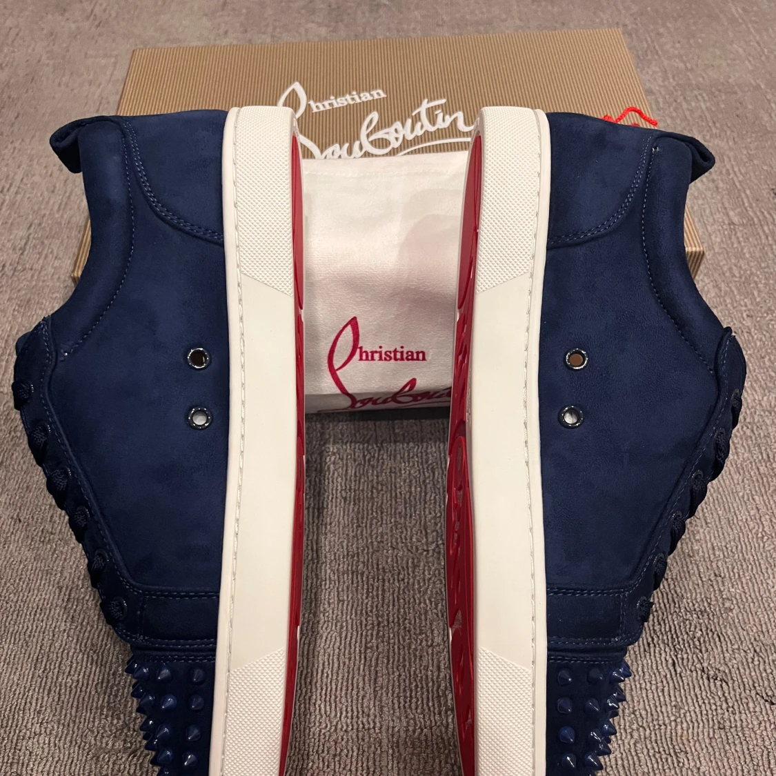 Snygga mörkblå skor från Christian Louboutin i mocka med ikoniska röda sulor. Skorna har rund tå, snörning och coola nitar på tån för en edgy look. Insidan är beige och sulan är vit. Perfekta för dig som vill sticka ut med exklusiv stil.