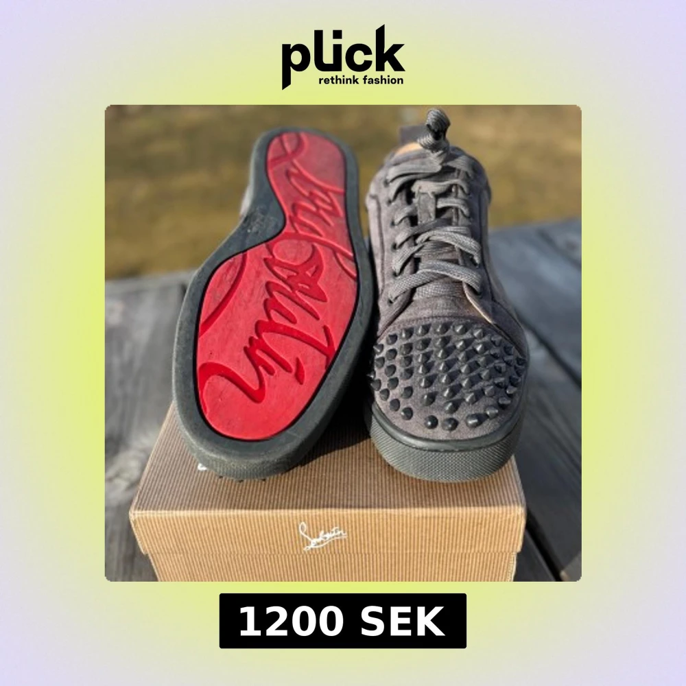Snygga grå sneakers i mocka från Christian Louboutin med coola nitar på tån och sidorna. Skorna har en klassisk röd sula och snörning framtill. Perfekta för att ge din outfit en edgy touch.