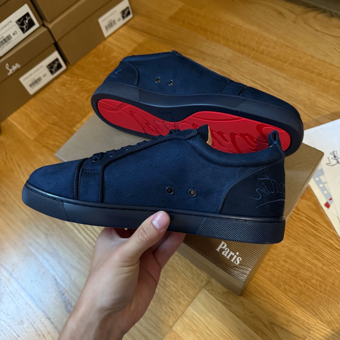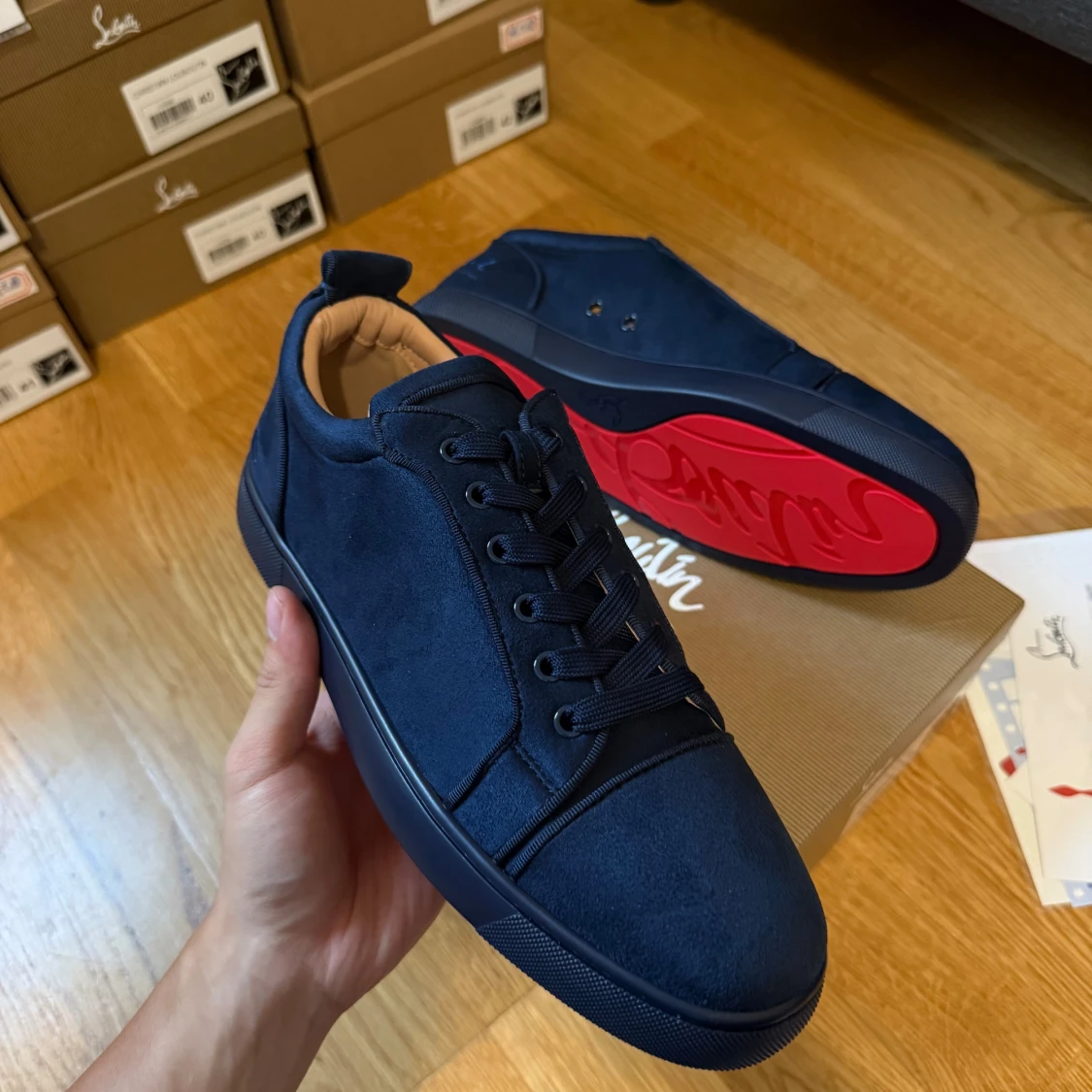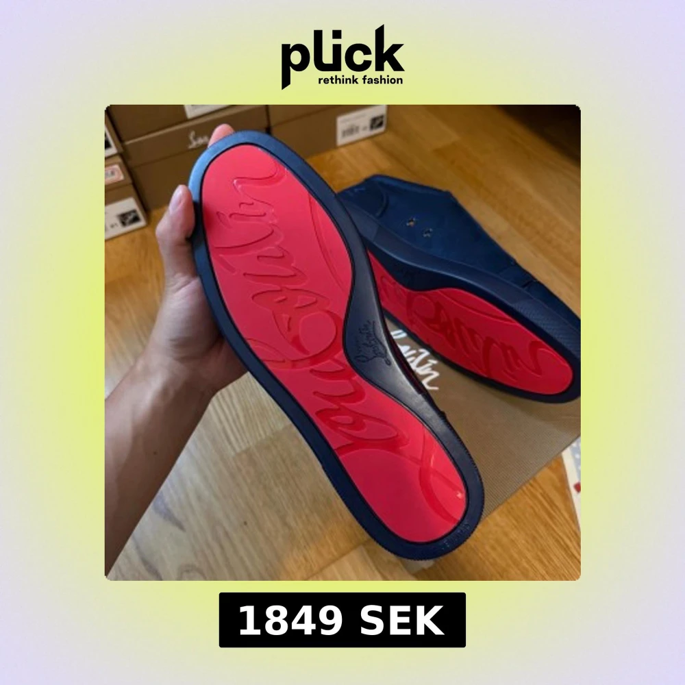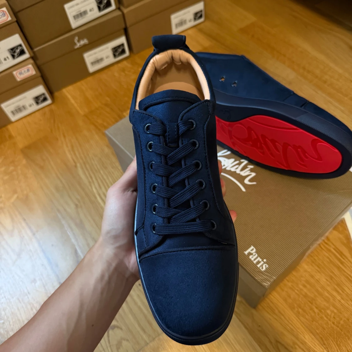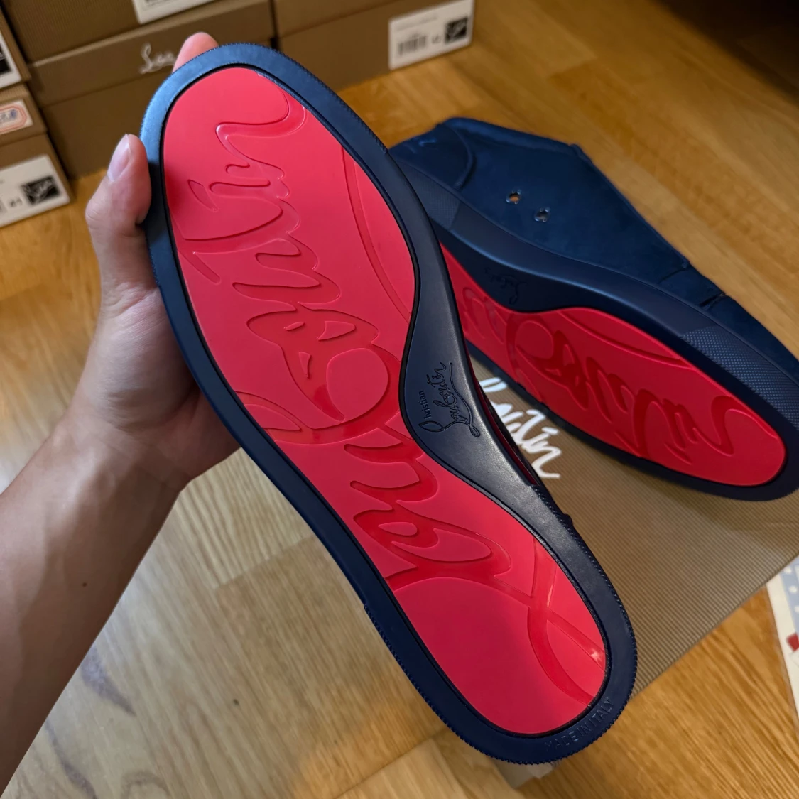 Snygga marinblå sneakers från Louboutin med ikonisk röd sula och diskret broderad logga på hälen. Skorna har rund tå, snörning och är tillverkade i mocka med mjukt skinnfoder. Perfekt för dig som vill sticka ut med stilrena detaljer och lyxig känsla.