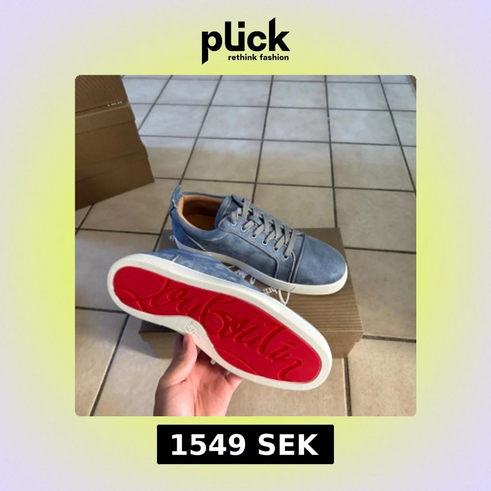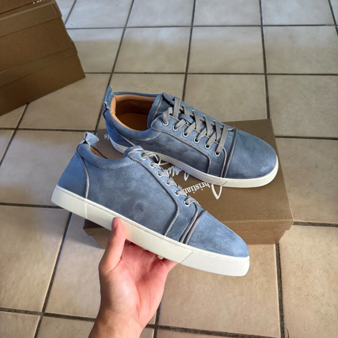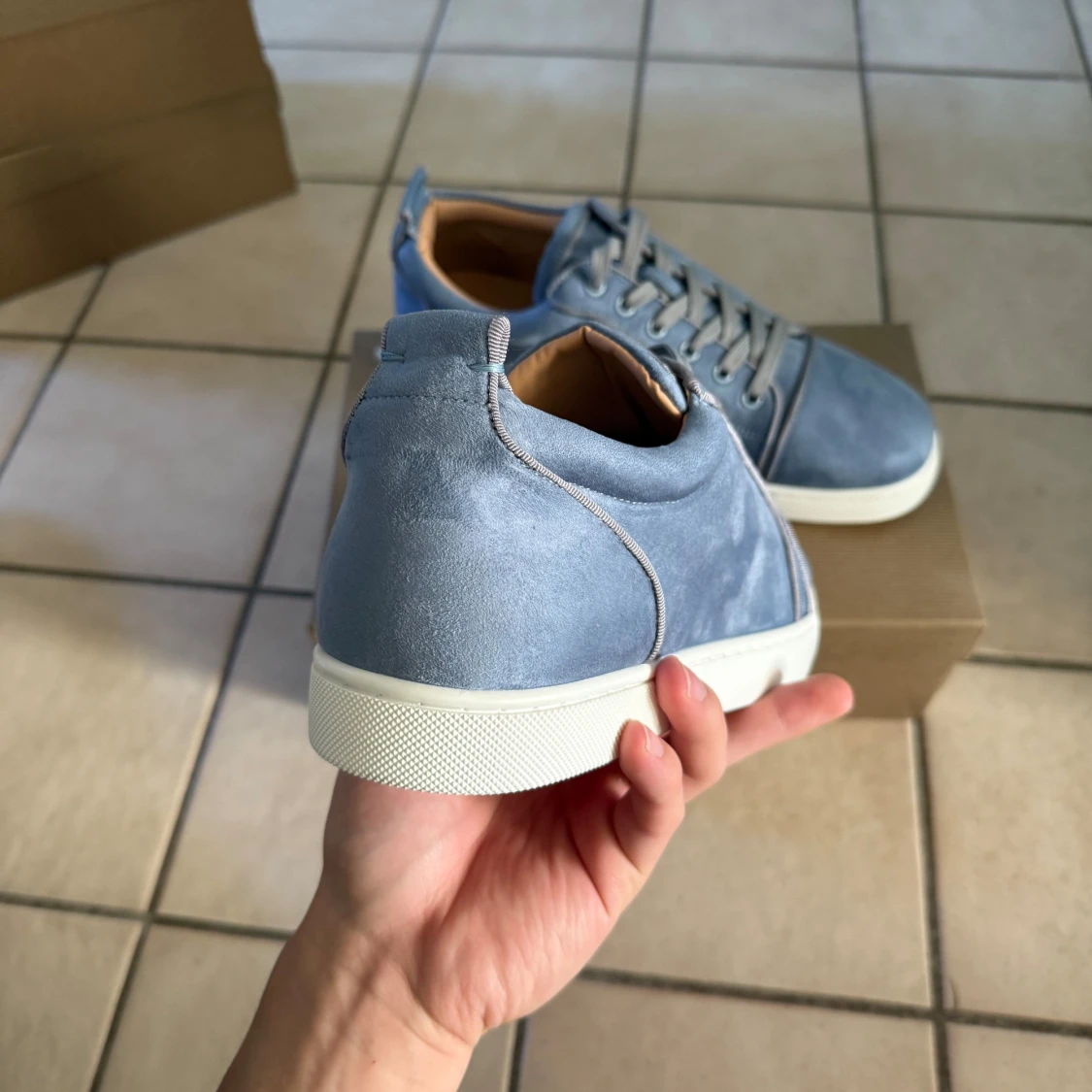 Snygga blå sneakers från Christian Louboutin i mjuk mocka med klassisk röd sula och vita kanter. Skorna har rund tå, platt sula och grå snörning. Perfekta för dig som vill sticka ut med exklusiva detaljer och stilren design.