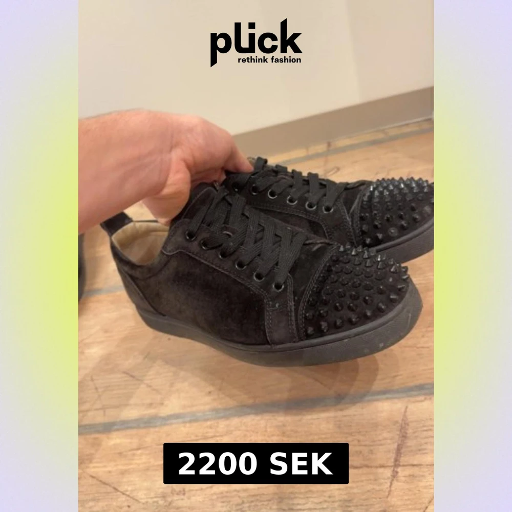 ✅KVITTO FINNS✅Säljer ett par svarta sneakers från Christian Louboutin med coola svarta nitar på tån och klassisk röd sula. Skorna har snörning och är gjorda i mocka med detaljer i skinn. Perfekt för dig som gillar edgy stil och vill sticka ut.