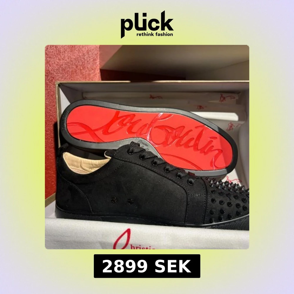 Snygga svarta skor från Christian Louboutin med ikonisk röd sula och coola nitar på ovansidan. Skorna har snörning och är tillverkade i mocka, vilket ger en lyxig känsla. Perfekta för att ge din stil en edgy touch. Hör av er vid minsta fundering 🍾OBS! Priset är inte hugget i sten