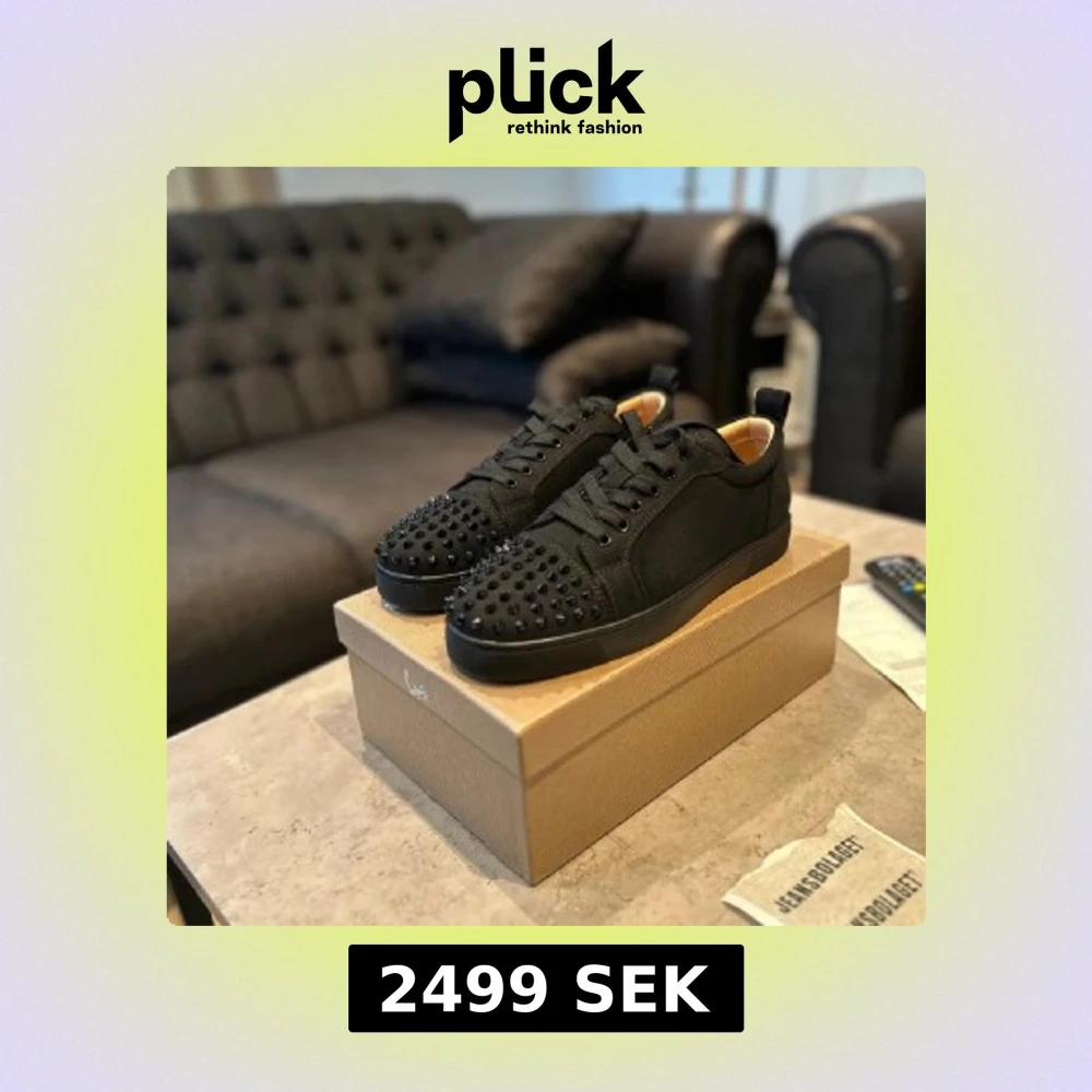 Snygga svarta sneakers från Louboutin med mattsvarta nitar på tån och den ikoniska röda sulan. Skorna har snörning, rund tå och är tillverkade i textil och skinn. Perfekta för dig som vill sticka ut med en edgy och lyxig stil.