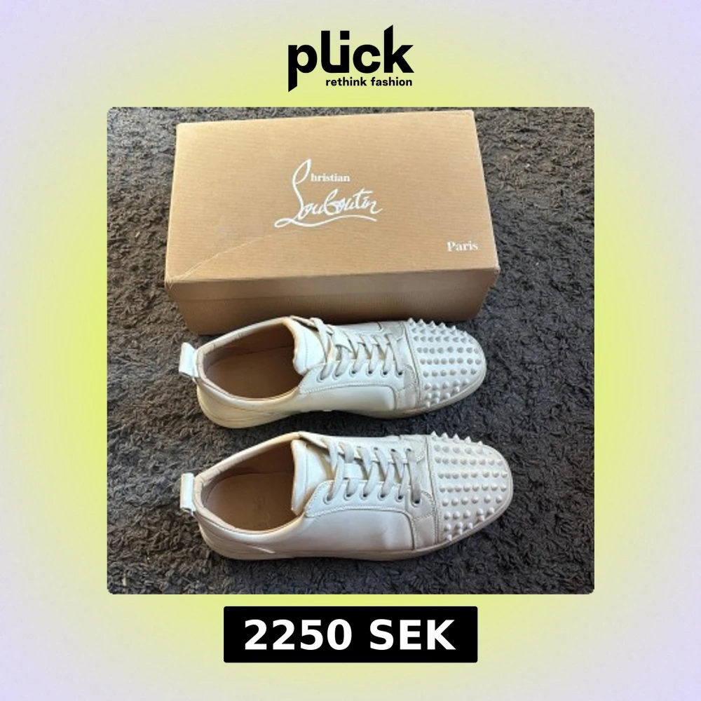Säljer ett par vita sneakers från Christian Louboutin med ikoniska röda sulor och coola nitar på tån. Skorna har snörning och är tillverkade i skinn, vilket ger en lyxig känsla. Perfekta för dig som vill sticka ut med en edgy och exklusiv stil. Saknar dock en spick men den går att lägga på