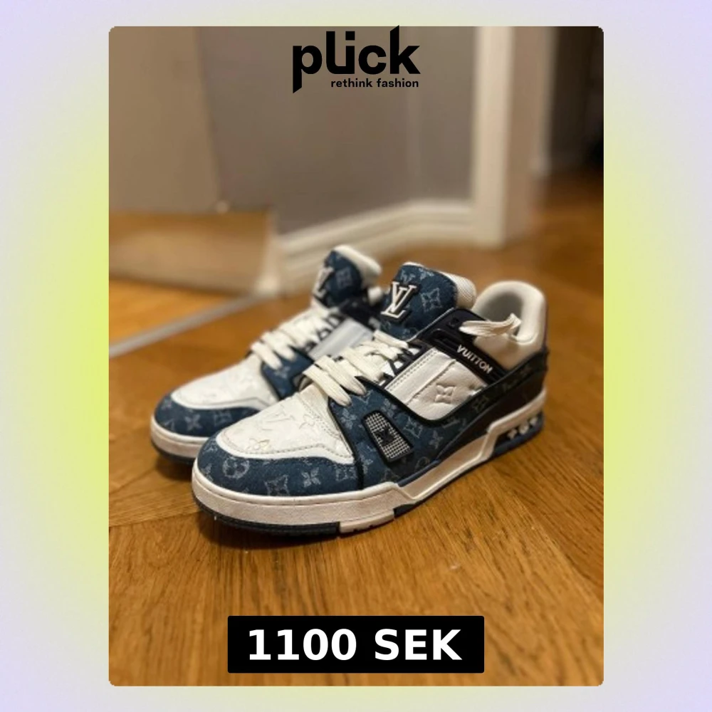Säljer ett par Louis Vuitton sneakers i blått och vitt med klassiskt monogrammönster. Skorna har snörning, platt sula och rund tå. Materialet är en mix av skinn och textil med tydliga LV-detaljer på plösen och sidorna. Perfekt för dig som gillar lyxiga streetwear-vibes.