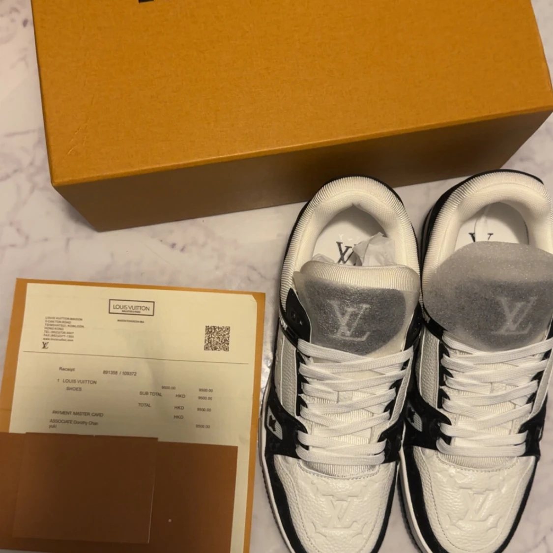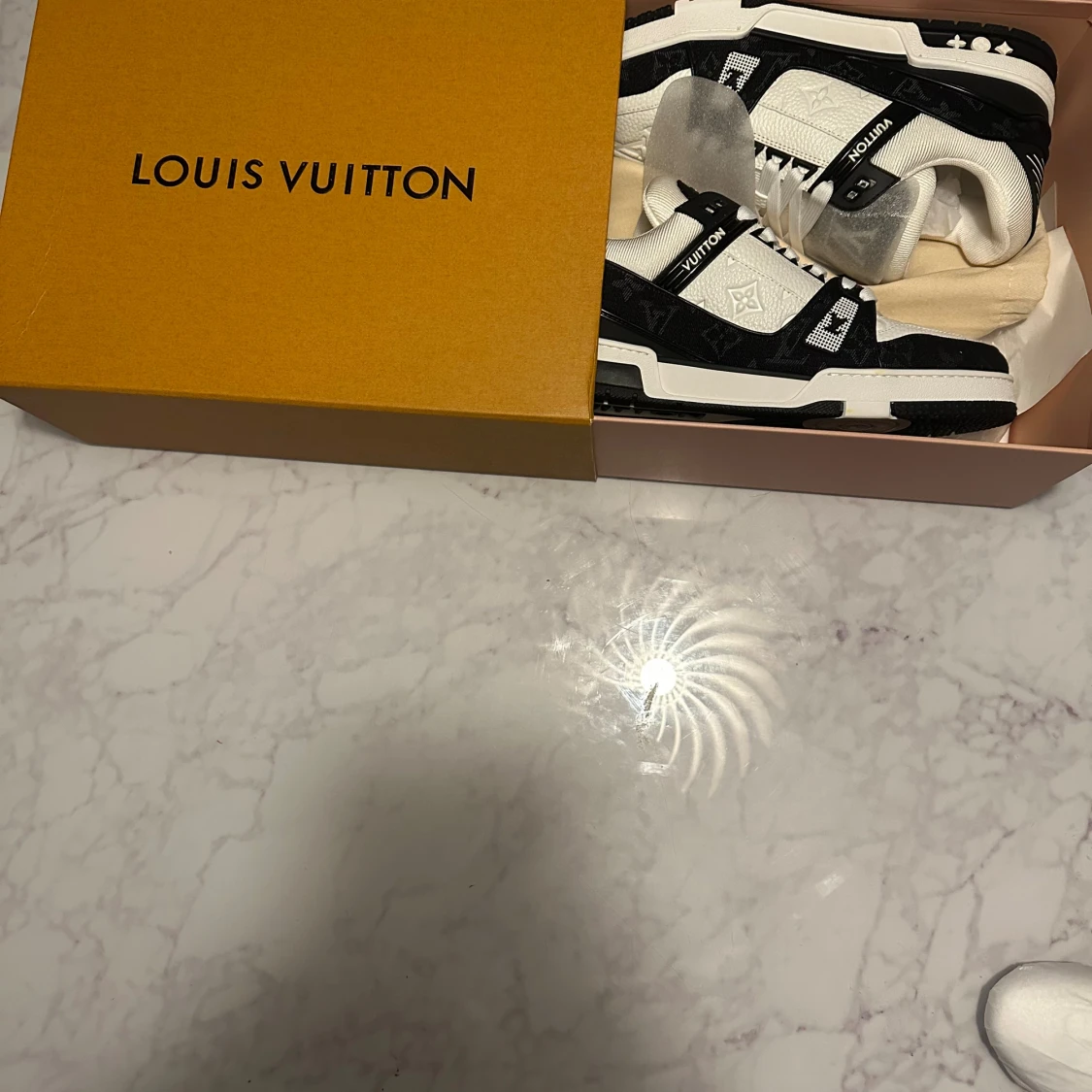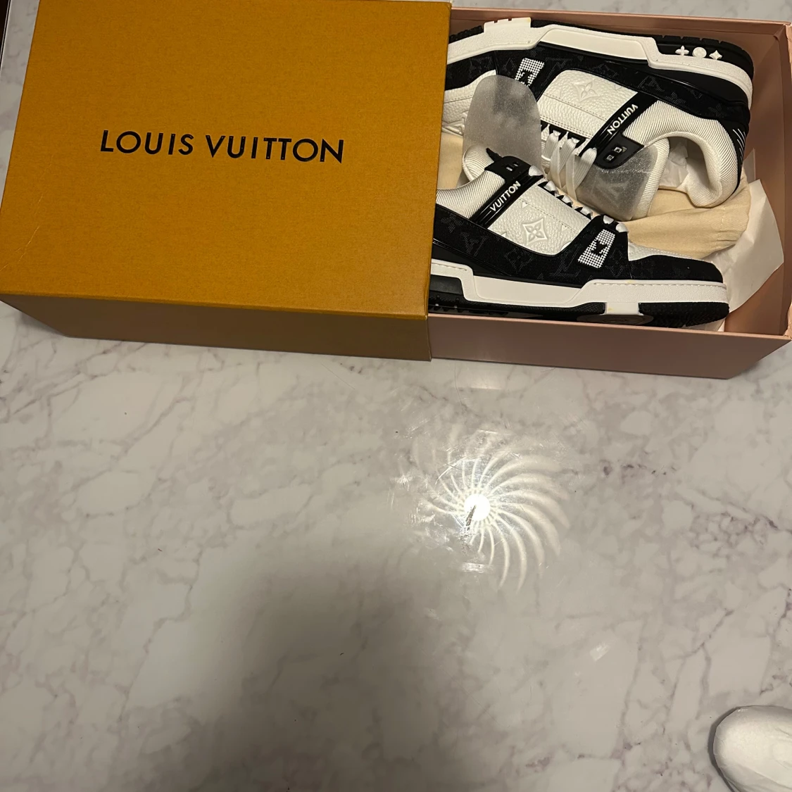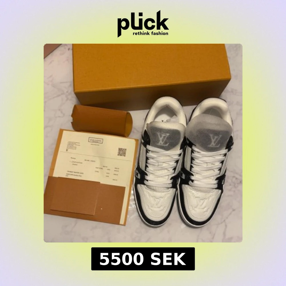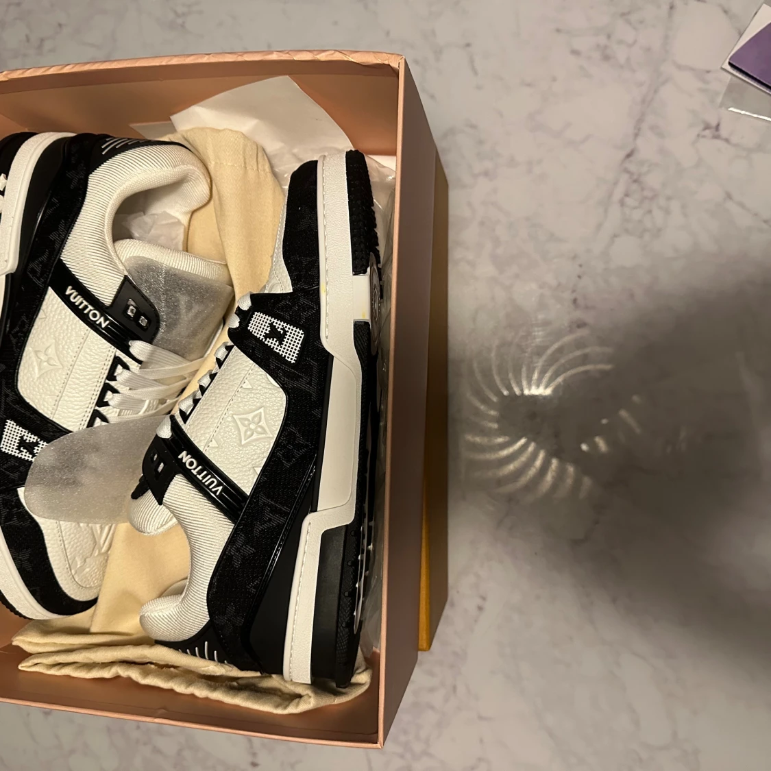 Säljer ett par Louis Vuitton sneakers i svart och vitt med tydliga LV-loggor på tungan och sidan. Skorna har snörning, platt sula och är tillverkade i en mix av skinn och textil. Snygg kontrast mellan svart och vitt, samt diskreta monogramdetaljer på panelerna.