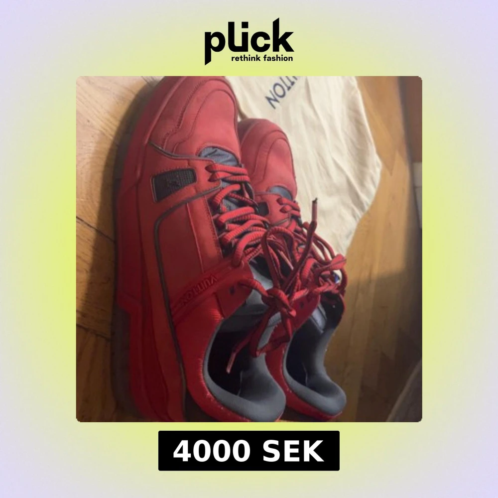 Säljer ett par röda Louis Vuitton sneakers med svarta detaljer och LV-logga på hälen. Skorna har snörning, rund tå och är tillverkade i en mix av skinn och textil. Snygg design med tydliga logodetaljer och robust sula. Perfekta för dig som vill sticka ut med lyxiga sneakers.