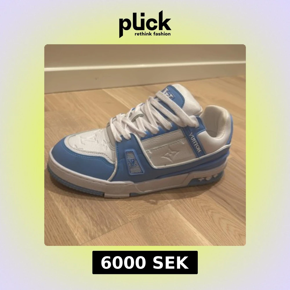 Snygga Louis Vuitton sneakers i vitt och ljusblått med klassiska LV-loggor på sidan, tungan och hälen. Skorna har snörning, platt sula och är tillverkade i skinn och syntet. Perfekta för dig som vill sticka ut med exklusiv streetstyle,det kommer även med kvitto!