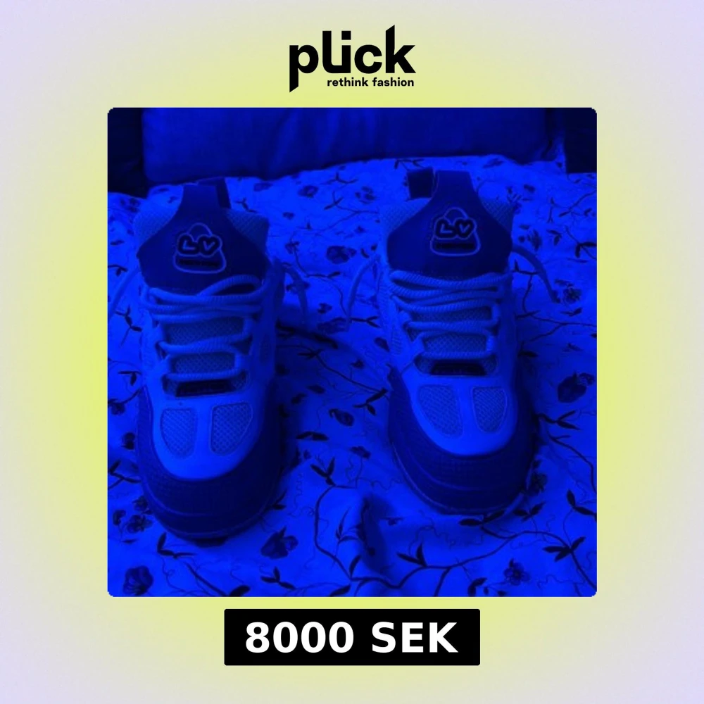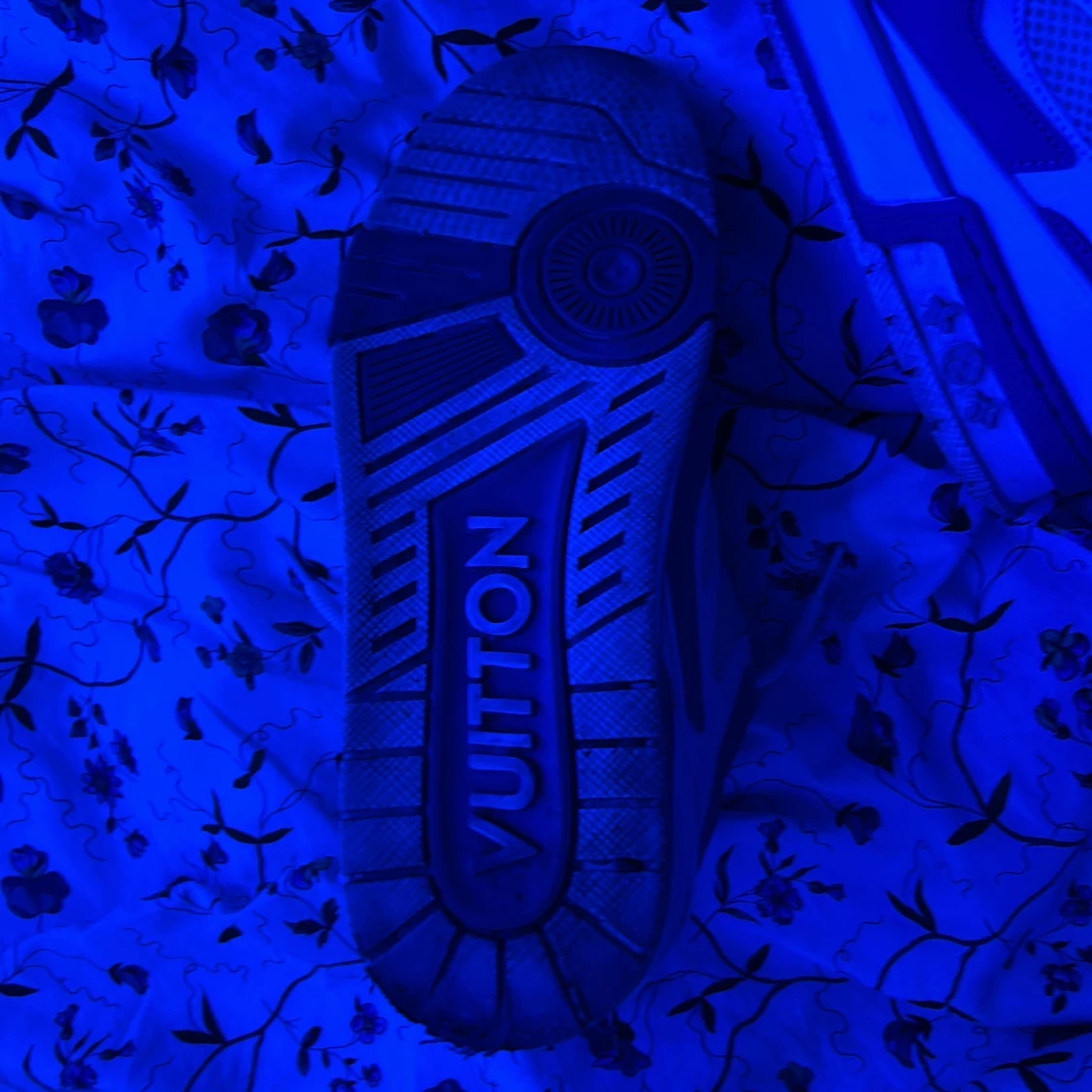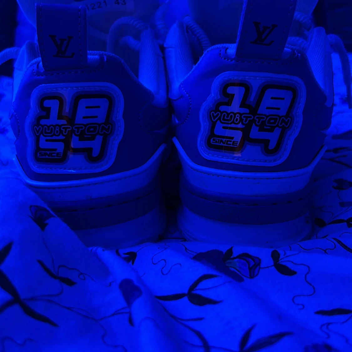 Säljer ett par Louis Vuitton LV Trainer sneakers med ikoniska LV-detaljer och blommor på sidorna. Skorna är vita med inslag av grått och har meshpaneler, skinn och snörning. Snygg chunky sula med Vuitton-logga undertill. Perfekta för dig som vill sticka ut med lyxig streetstyle. Använda ett par gånger, syns lite under skon men på utsidan ser dom helt nya ut!
