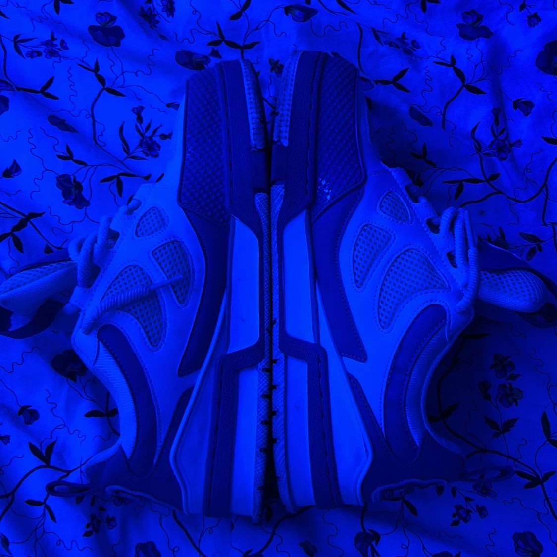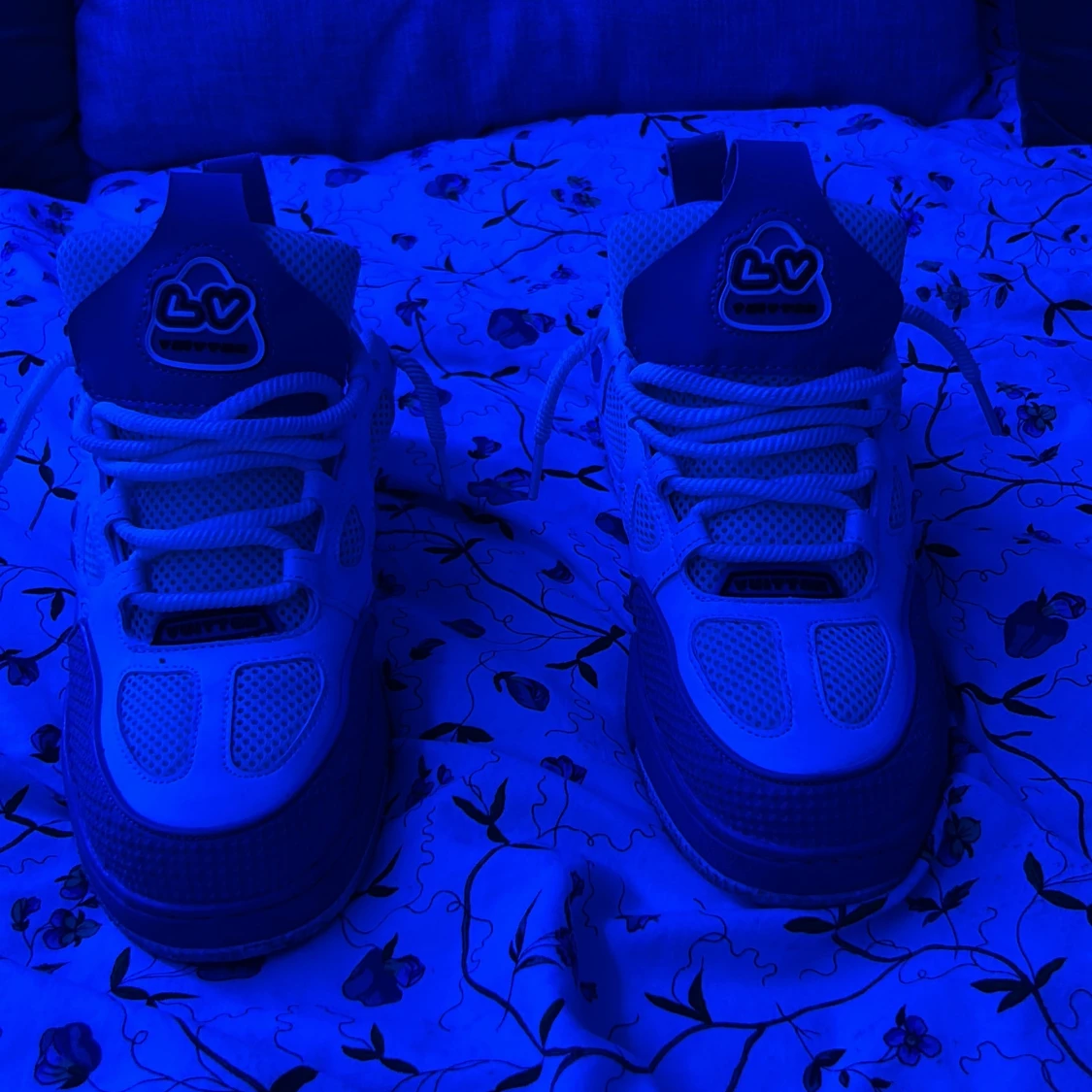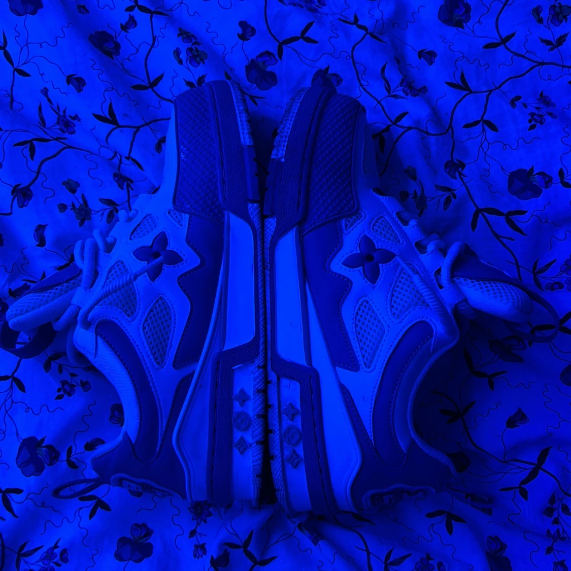 Säljer ett par Louis Vuitton LV Trainer sneakers med ikoniska LV-detaljer och blommor på sidorna. Skorna är vita med inslag av grått och har meshpaneler, skinn och snörning. Snygg chunky sula med Vuitton-logga undertill. Perfekta för dig som vill sticka ut med lyxig streetstyle. Använda ett par gånger, syns lite under skon men på utsidan ser dom helt nya ut!