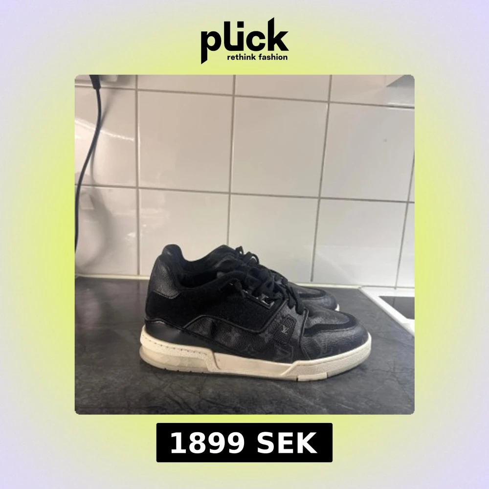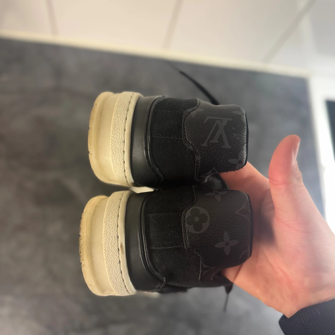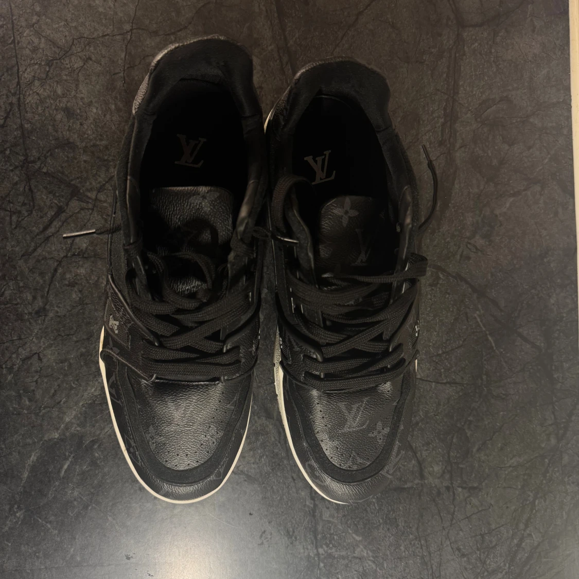 Svarta Louis Vuitton sneakers i skinn med klassiskt monogrammönster och vita sulor. Skorna har snörning och rund tå, samt diskreta LV-detaljer på sidan och hälen. Snygg kontrast mellan svart ovandel och vit sula, perfekt för dig som gillar lyxiga streetwear-vibbar.