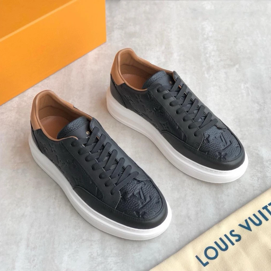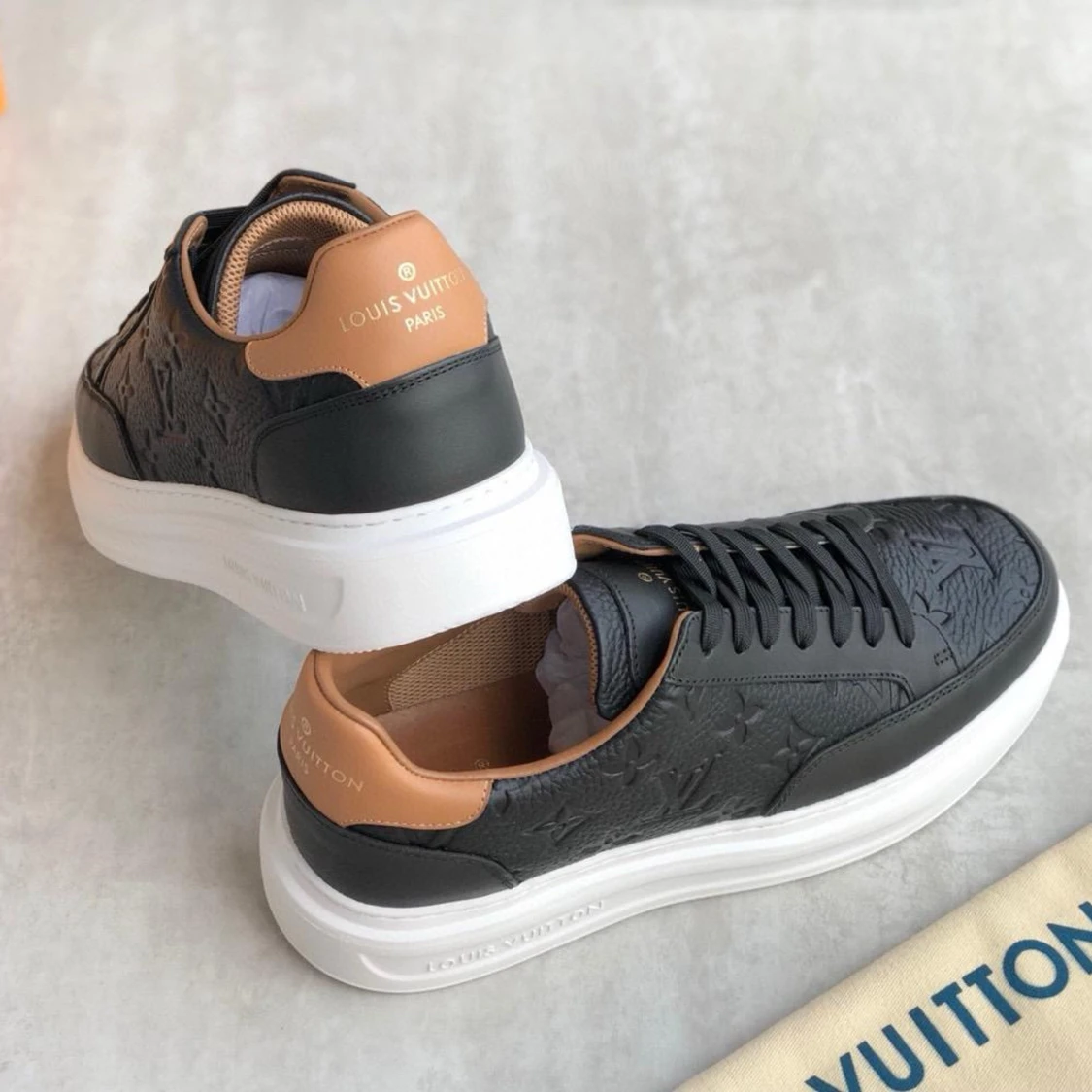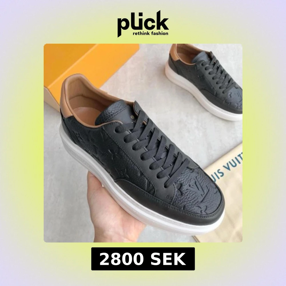 Snygga svarta Louis Vuitton sneakers i präglat skinn med klassiskt LV-mönster. Skorna har vita platta sulor, svarta snören och beige detaljer vid häl och insida. Perfekta för dig som vill ha en lyxig och stilren look med exklusiv känsla. Fler storlekar finns