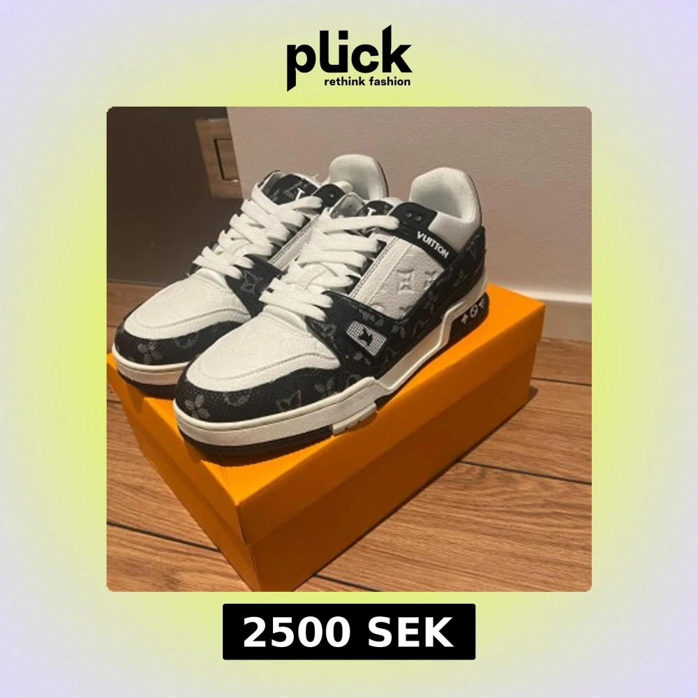 Säljer ett par Louis Vuitton sneakers i svart och vitt med klassiskt monogrammönster. Skorna har snörning, platt sula och rund tå. Materialet är en mix av skinn och textil, med tydliga LV-detaljer på sidan och hälen. Perfekt för dig som vill sticka ut med lyxig streetstyle.