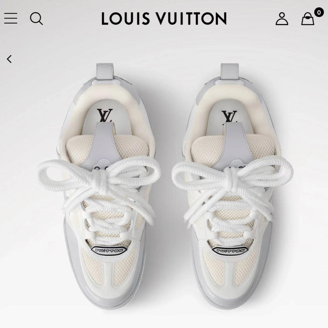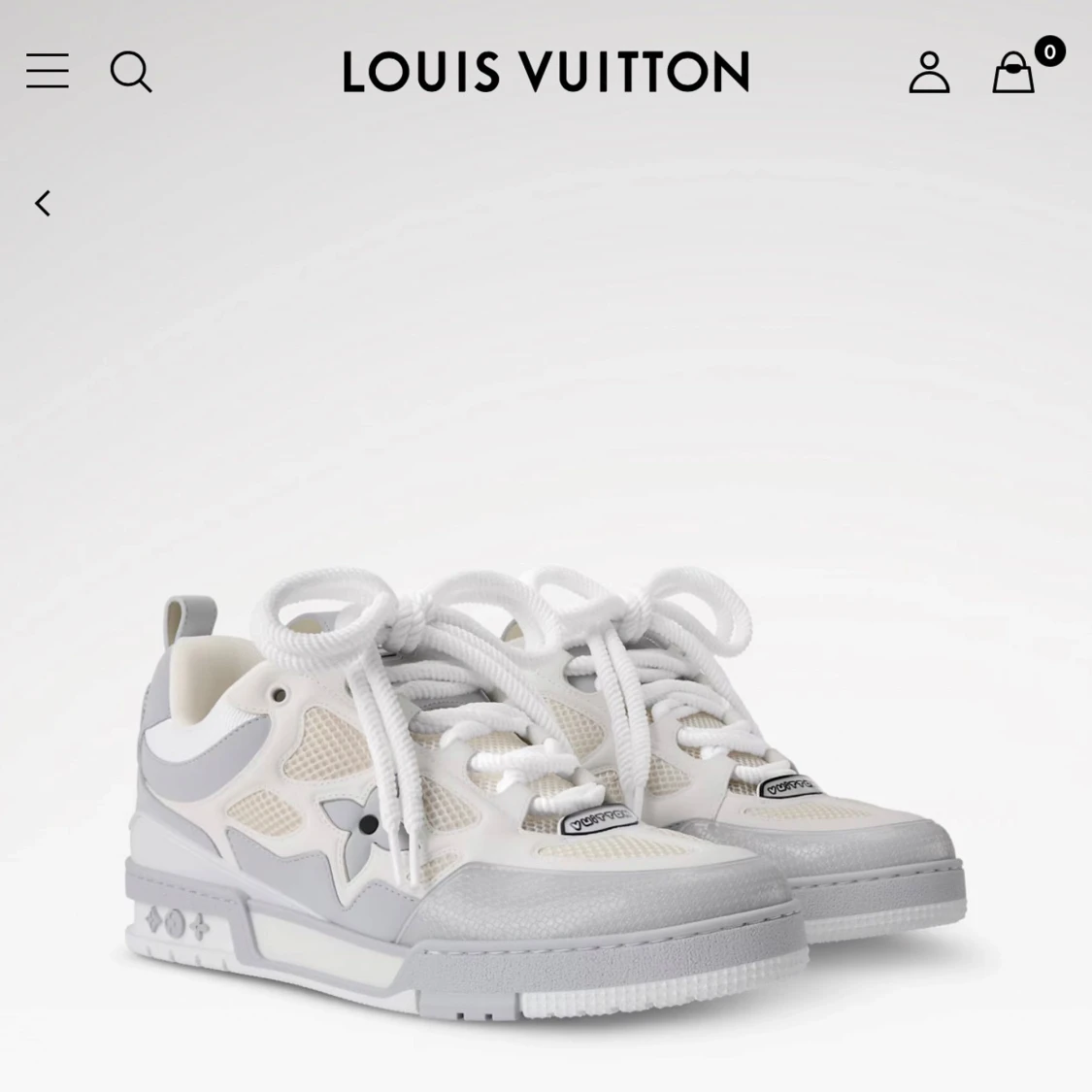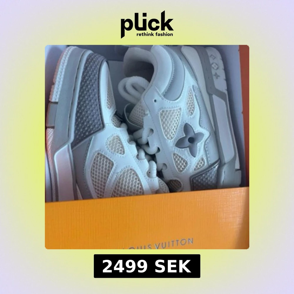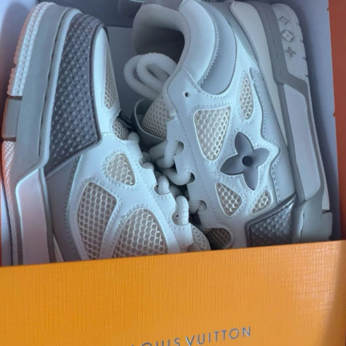 Snygga Louis Vuitton sneakers i vitt och ljusgrått med LV-logga och blomdetalj på sidan. Skorna har en mix av mesh och skinn, chunky sula och coola detaljer. Perfekta för dig som vill sticka ut med exklusiva sneakers och streetstyle-vibe.