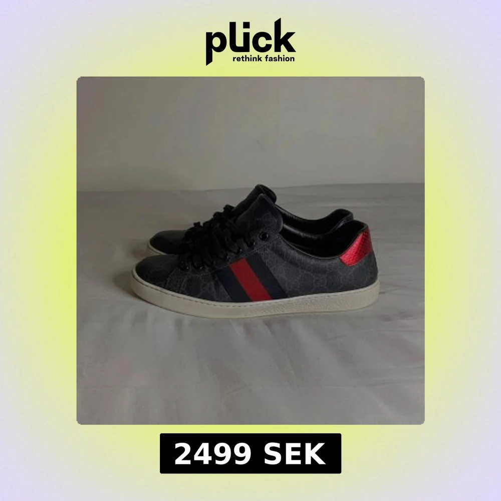 Snygga svarta sneakers från Gucci med röda och blå detaljer på hälen. Skorna har en vit sula och klassisk snörning. Riktigt fräscha och passar under alla tillfällen. Inget og medföljs 🌎