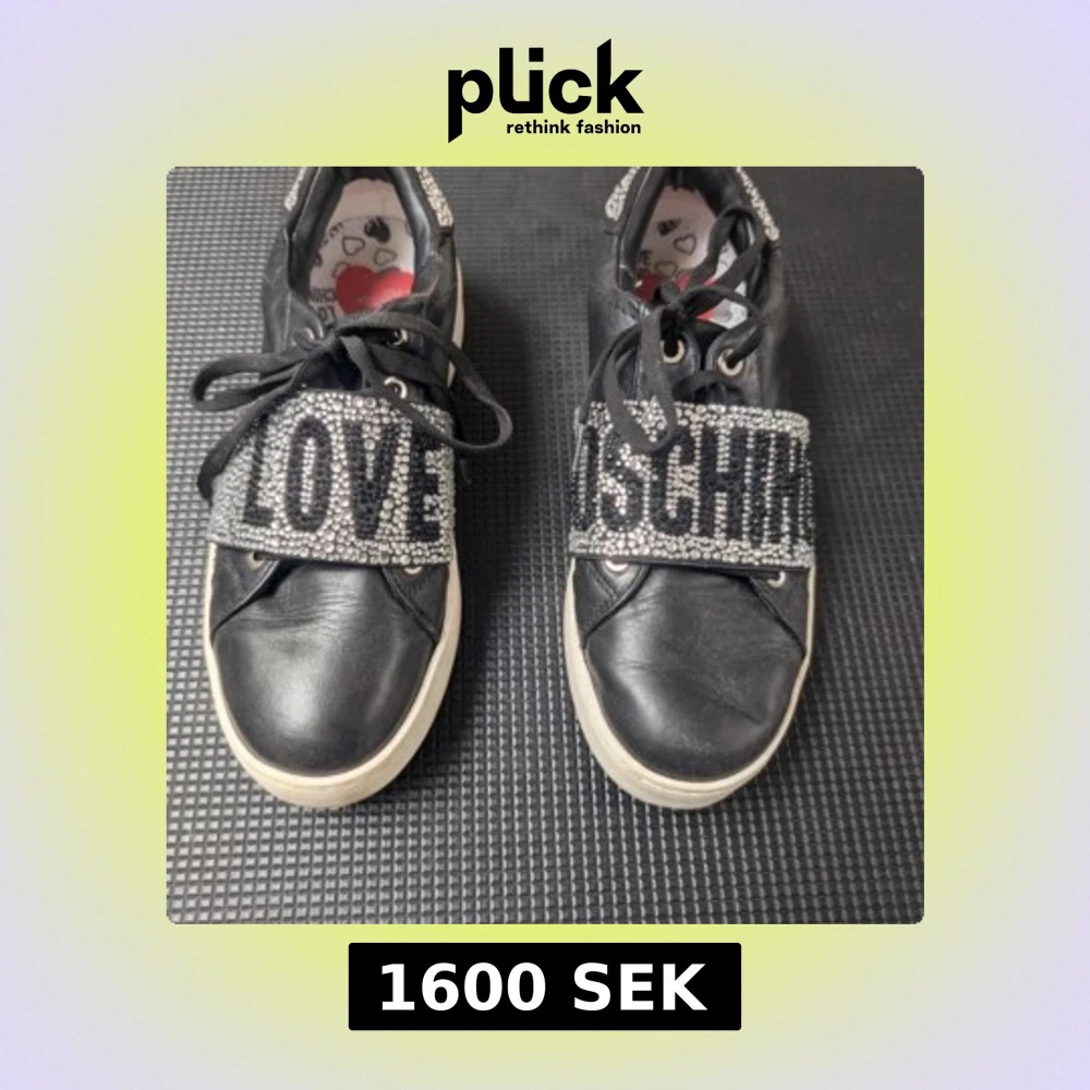 Svarta sneakers från Love Moschino i skinn med vita sulor och stora glittriga strassdetaljer över snörningen där det står 'LOVE' och 'MOSCHINO'. Dekorerade med hjärtan och strass även på hälen. Snygg och unik design som sticker ut. Använda ett fåtal gånger